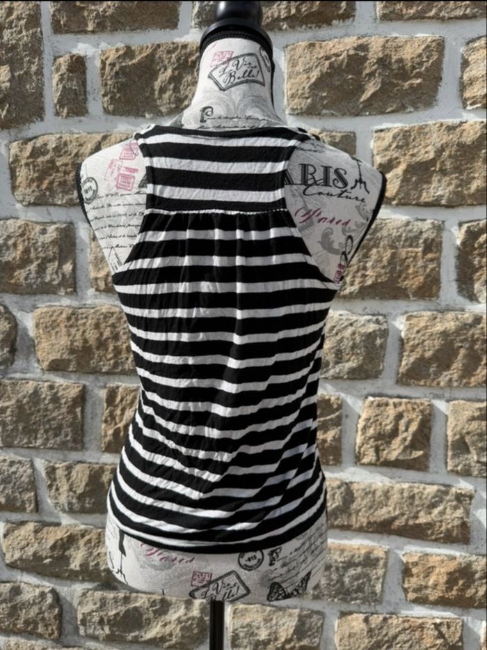 Débardeur à rayures noir et blanc – Léger & confortable Débardeur à rayures noires et blanches, en matière fluide et légère, très agréable à porter, surtout en été. Coupe simple et facile à assortir, parfait pour un look casual ou plus habillé. 🧵 Petit défaut à noter : un léger trou à l’avant, mais il ne se voit pas une fois porté. À part cela, il est en bon état général. Petit prix pour une pièce sympa malgré ce petit défaut 😊 N’hésitez pas si vous avez des questions !