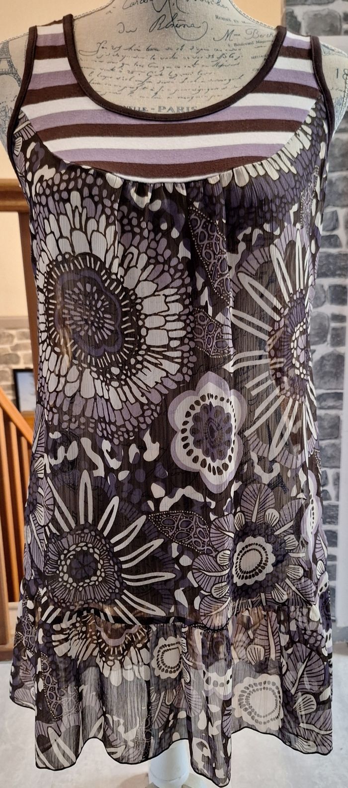 Longue tunique transparente à l'imprimé mauve et blanc