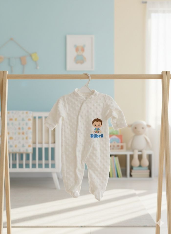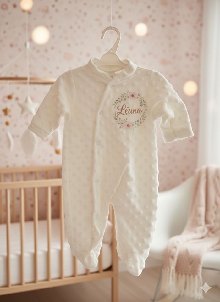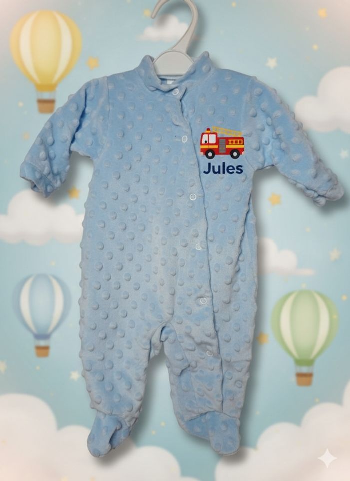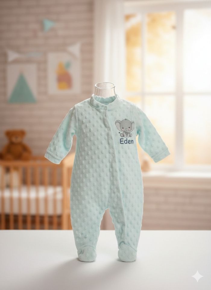 Pyjama en minky en vert bleu ou crème Taille 6 mois Dessin et prenom au choix tous les thèmes sont possibles mickey roi lion jungle licorne .......