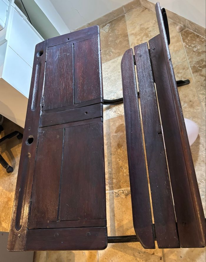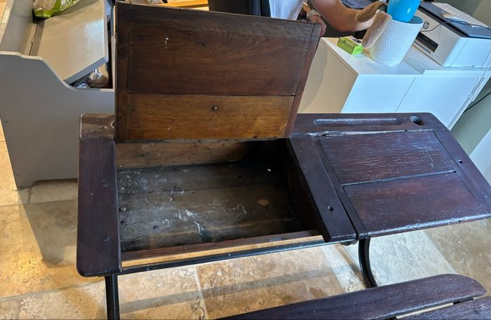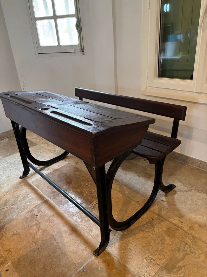 Attention remise en main propre uniquement et à venir chercher sur place (nous sommes dans le Vaucluse) Bureau d’écolier ancien, il a déjà été rénové mais il sera nécessaire de refaire un petit coup de propre. Il est dans un bon état, juste une charnière à changer comme montré sur la photo. Dimensions 118 cm de longueur 78cm de largeur 75cm de hauteur il est lourd prévoir deux personnes idéalement et un véhicule adapté. Espèces uniquement.