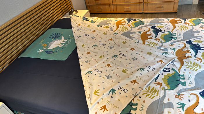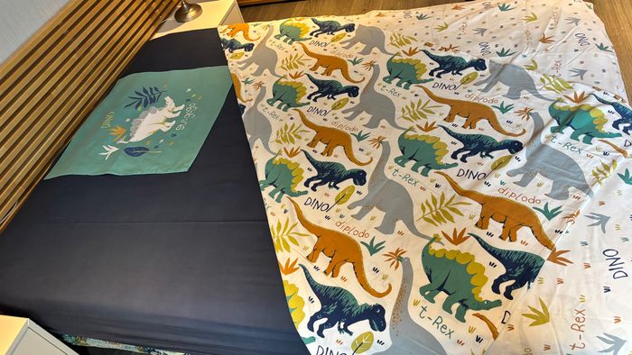 Housse de couette, housse de matelas et taie motifs dinosaures - Housse de couette 200x200cm rabat aux pieds BECQUET - housse de coussin 63X63cm BECQUET - housse de matelas unie bleue 140X200 Tissaia 100% coton Très bon état très peu utilisé voir TOUTES les photos