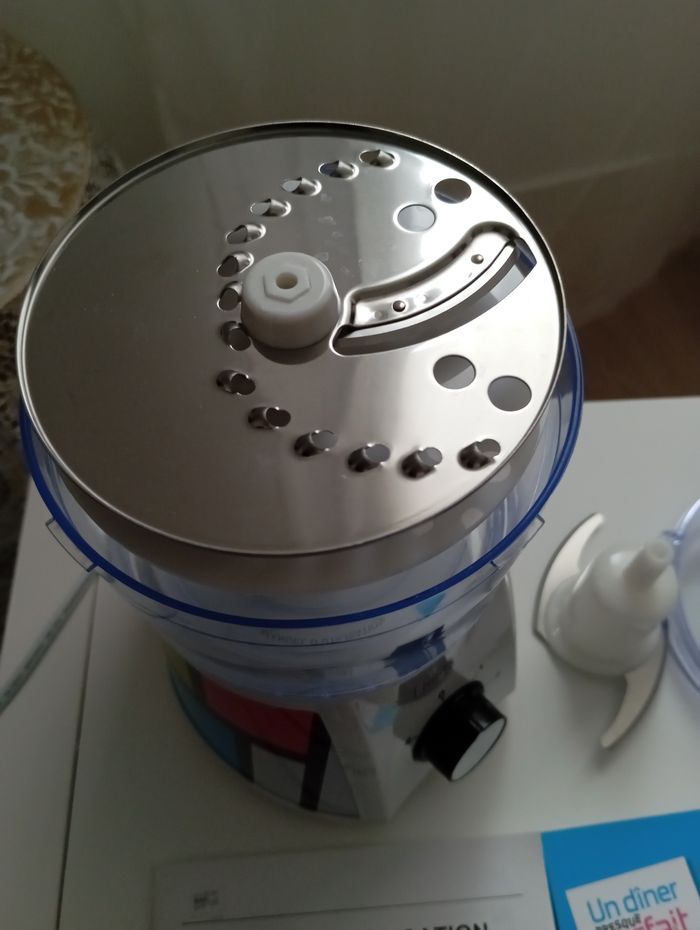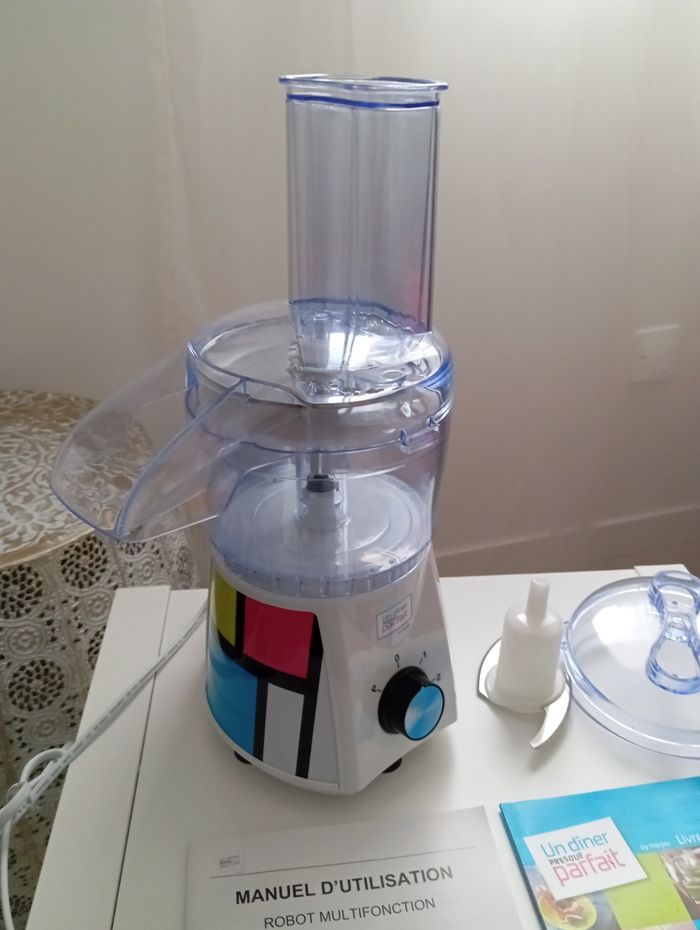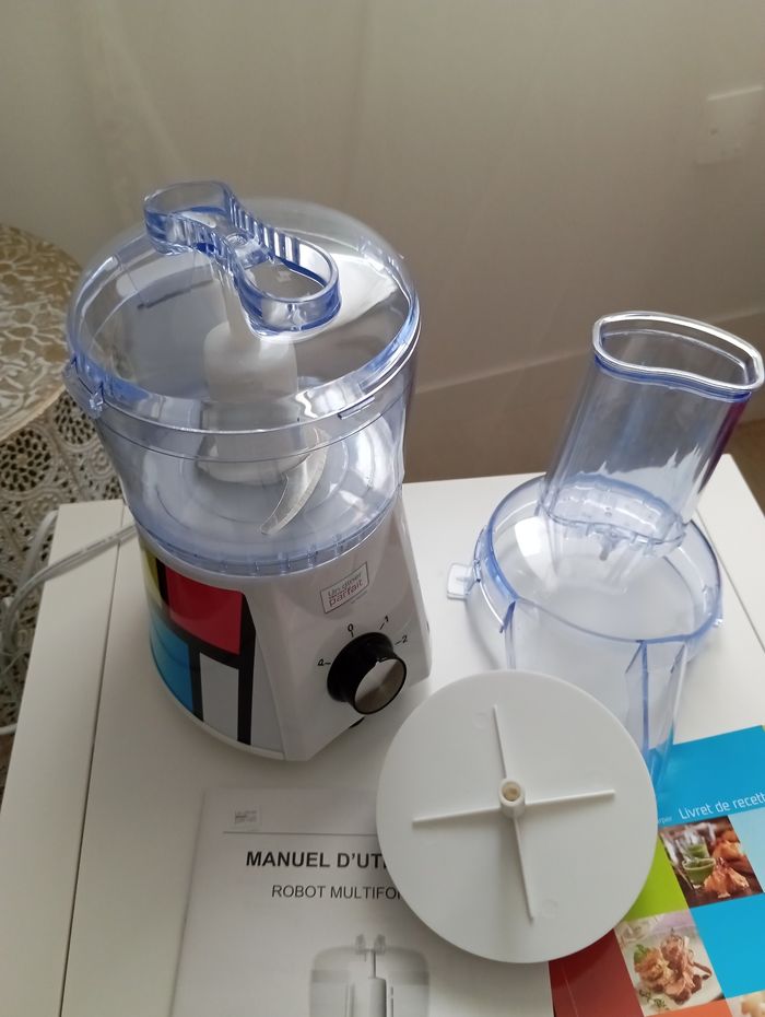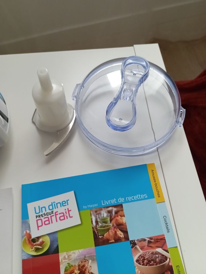 Petit robot multifonction de marque Harper, gamme un dîner presque parfait. Fonction 1 : râpe et tranche. Fonction 2 : hachoir. Article ouvert mais non utilisé, présence d' une petite rayure sur l article (je pense mal stocker dans l' armoire), j étudie donc toutes propositions de prix.