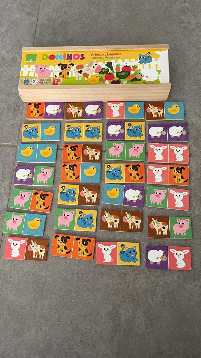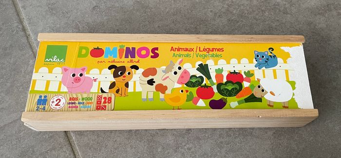 Dominos bois réversibles Animaux/Légumes Jeu complet marque Vilac 28 dominos en bois réversibles, un côté avec des animaux,l’autre avec des légumes jeux d’occasion Bon état (boite légèrement usée) voir TOUTES les photos