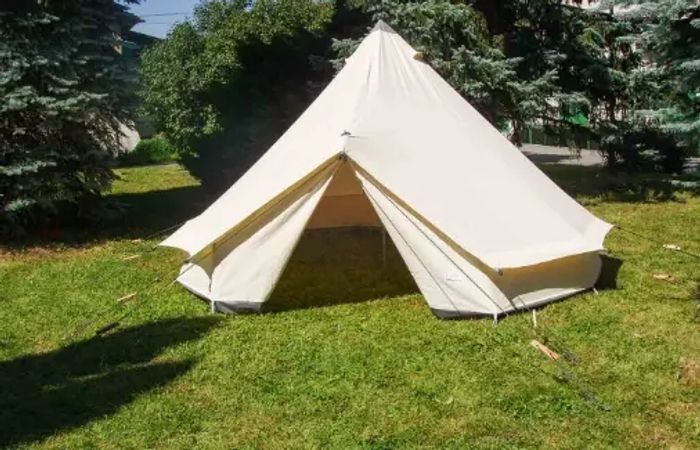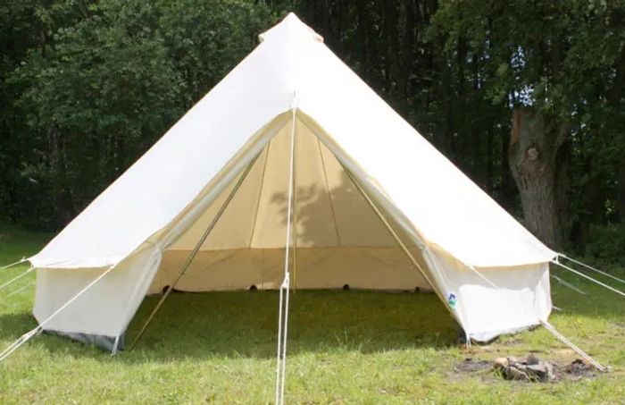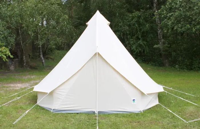 Diamètre 4 m50 Poids 24 kgs Hauteur au centre 3m Hauteur de la porte 1m70 Hauteur des murs 0,60 Toile 100 pour cent coton 300 gm2 Armature en acier galvanisé