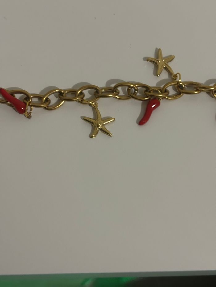 Magnifique bracelet doré orné de pendentifs étoiles de mer et petits charms rouges porte-bonheur. Un bijou original, lumineux et parfait pour apporter une touche estivale et tendance à toutes vos tenues ☀️❤️ ✔ Détails : • Chaîne dorée moderne • Charms étoile de mer + porte-bonheur • Style lumineux et tendance • Léger, confortable, facile à porter • Envoi rapide & soigné 📦