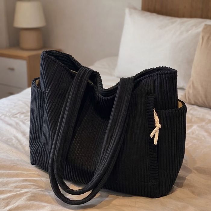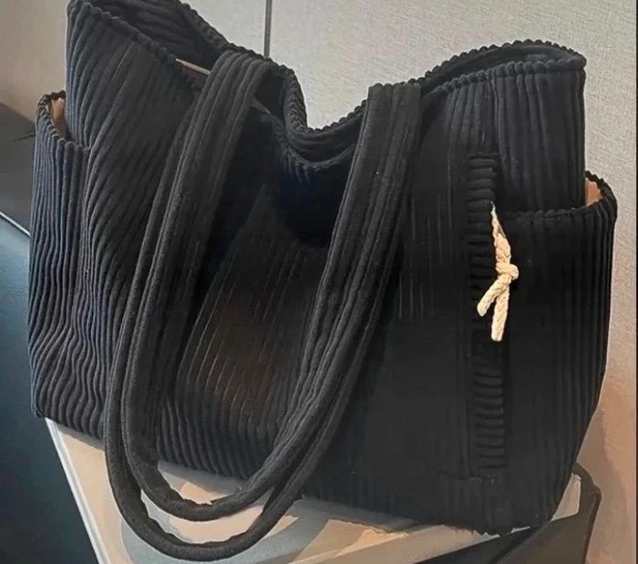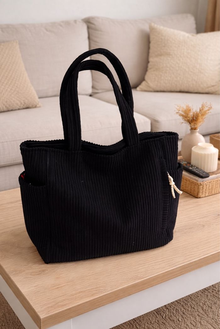 Sac velours cotelé noir 3 poches extérieures dont une avec fermeture éclair 2 poches intérieures avec une avec fermeture éclair #sac #sacnoir #velourscotele #sacfourretout #sacamain #fourretout