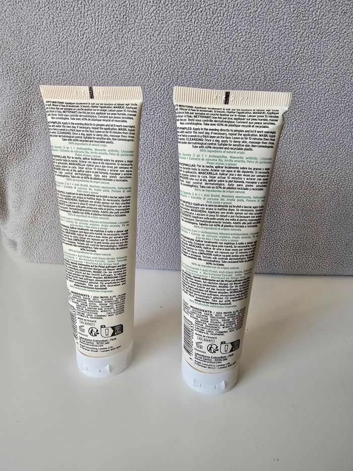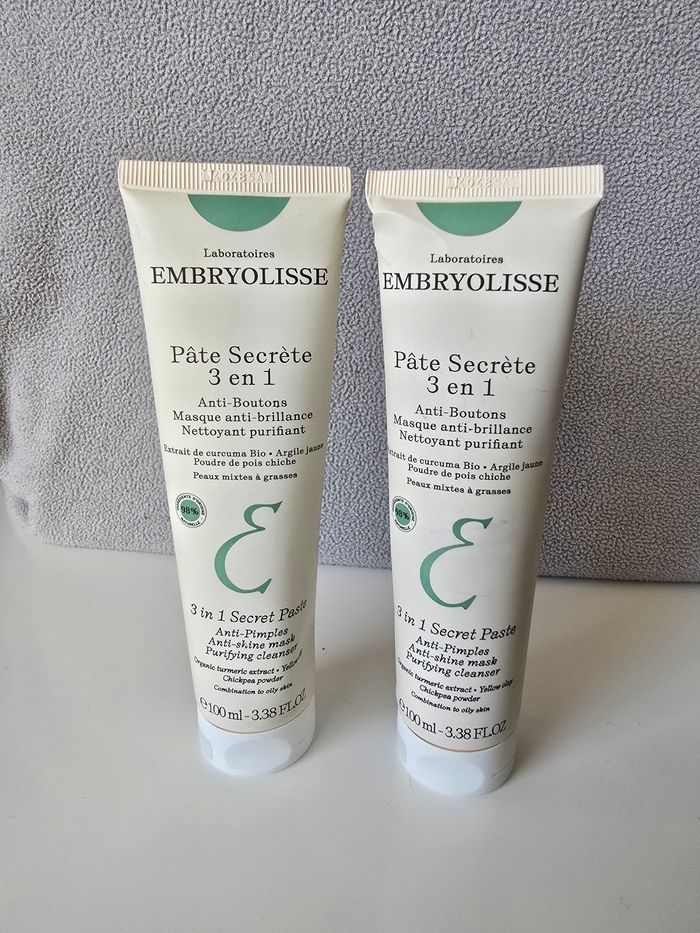 Produits neufs Jamais ouverts Pâte secrète 3 en 1                                                        EMBRYOLISSE anti bouton, masque anti brillance , nettoyant purifiant extrait de curcuma bio, argile jaune, poudre de pois chiches  pour les peaux mixtes et grasses