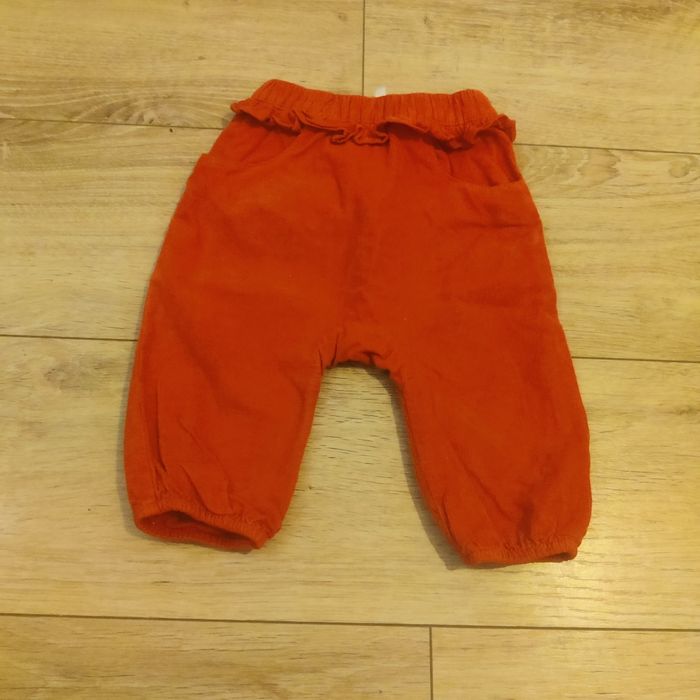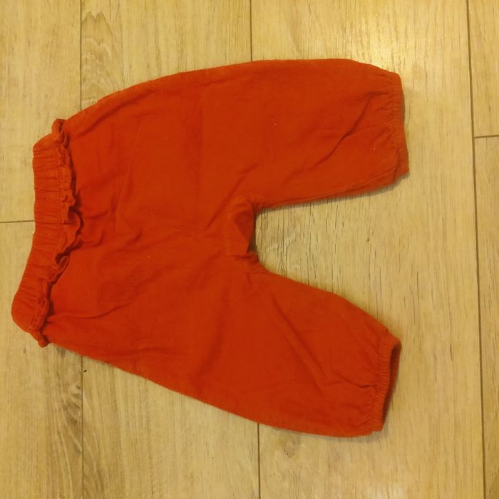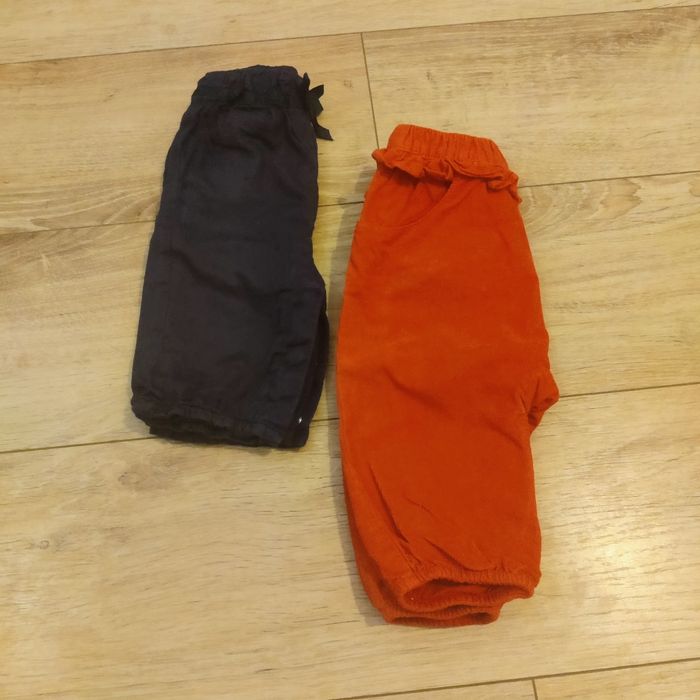 Lot de deux pantalons : - un bleu marine, impression d'étoiles en ton sur ton. Ouverture de l'entre-jambe par pressions. Tape à l'oeil - un rouge en velours côtelé. Orchestra. Maison non fumeur. Linge entretenu avec lessive écologique sans parfum et adoucissant au vinaigre blanc dilué. Envoi des colis les vendredis et samedis en général.