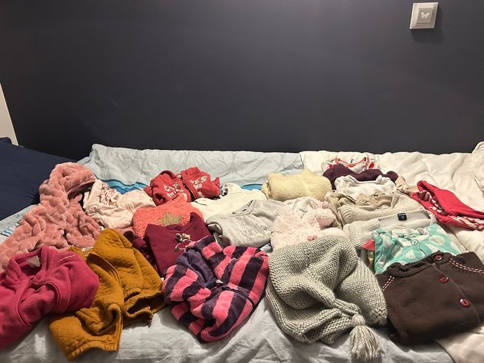 En bon état général sans tache ni trou Le lot comprend : - 7 robes -14 gilets ( plus ou moins épais ) - 9 pulls ( plus ou moins épais) - 5 pulls sans manches - 9 pyjamas ( dont 1 fin ) - 6 bodys - 22 tee shirt manches longues ( dont 5 col roulés ) - 18 pantalons ( plus ou moins épais) - 8 collants La dernières photos présente des habits que je ne compte pas car ils présentent des imperfections légères ( taches) mais ça peut toujours dépanner.