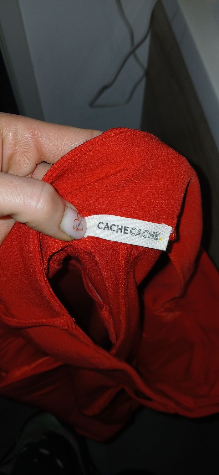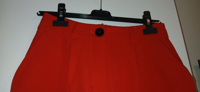 pantalon fluide à jambes larges et pinces à l'avant. Bouton contrastant noir Matière fluide et agréable à porter j'ai retiré l'étiquette de la taille qui était gênante mais c'est un 38 de chez cache cache