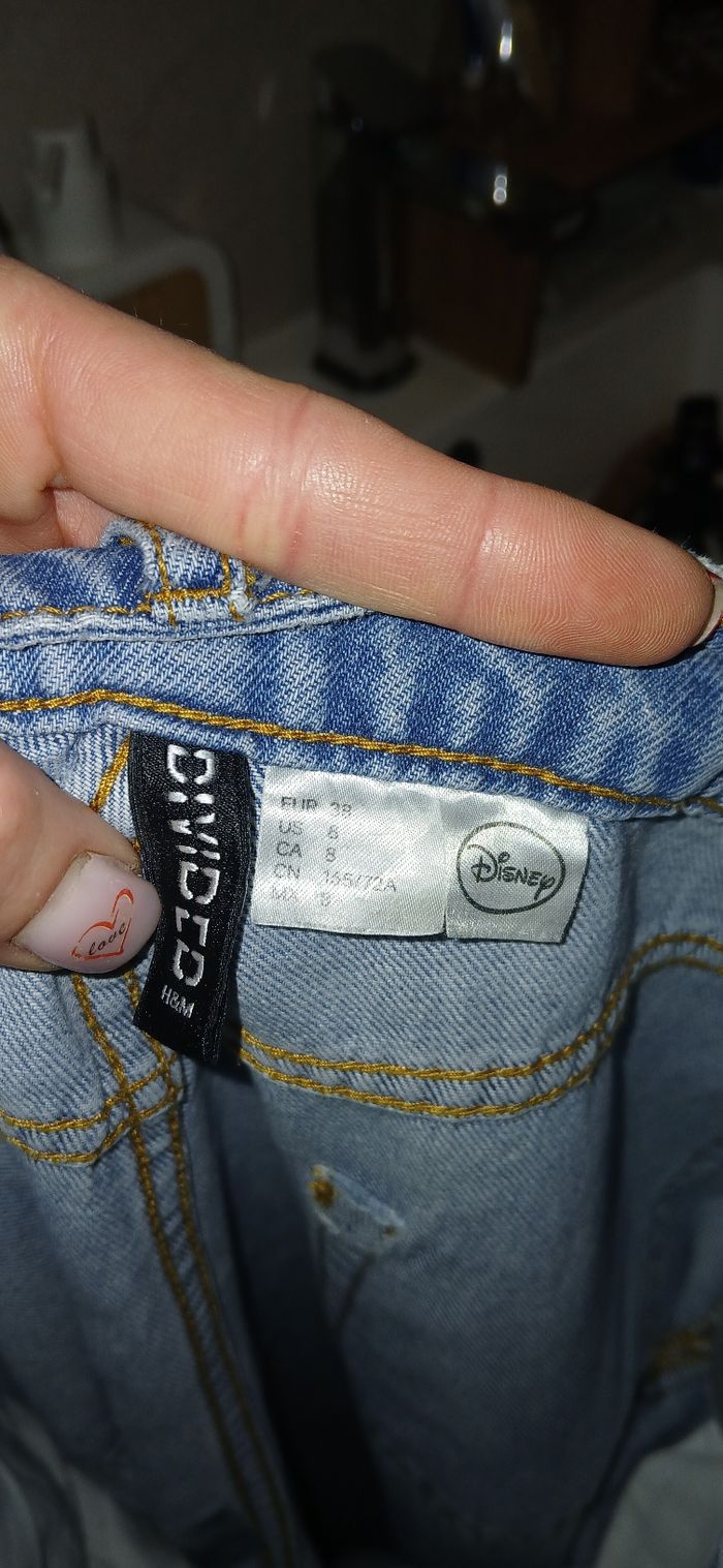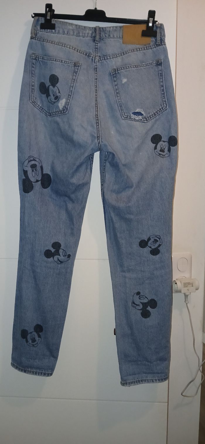jeans coupe droite effet used avec têtes de mickey. Couleur bleue délavé