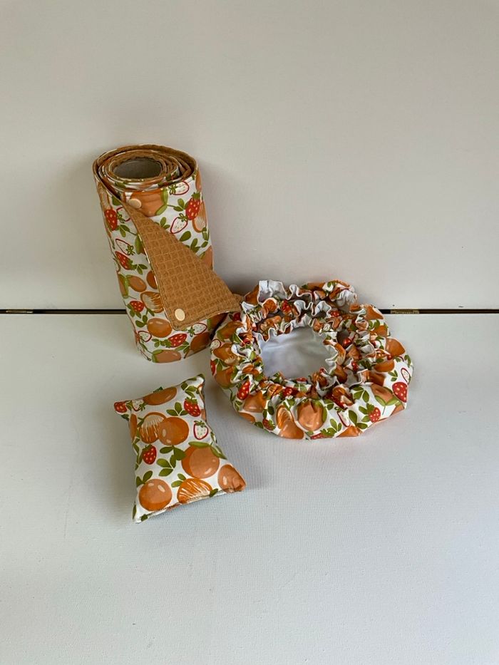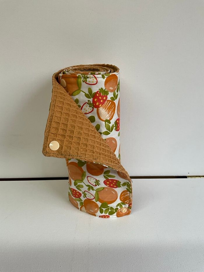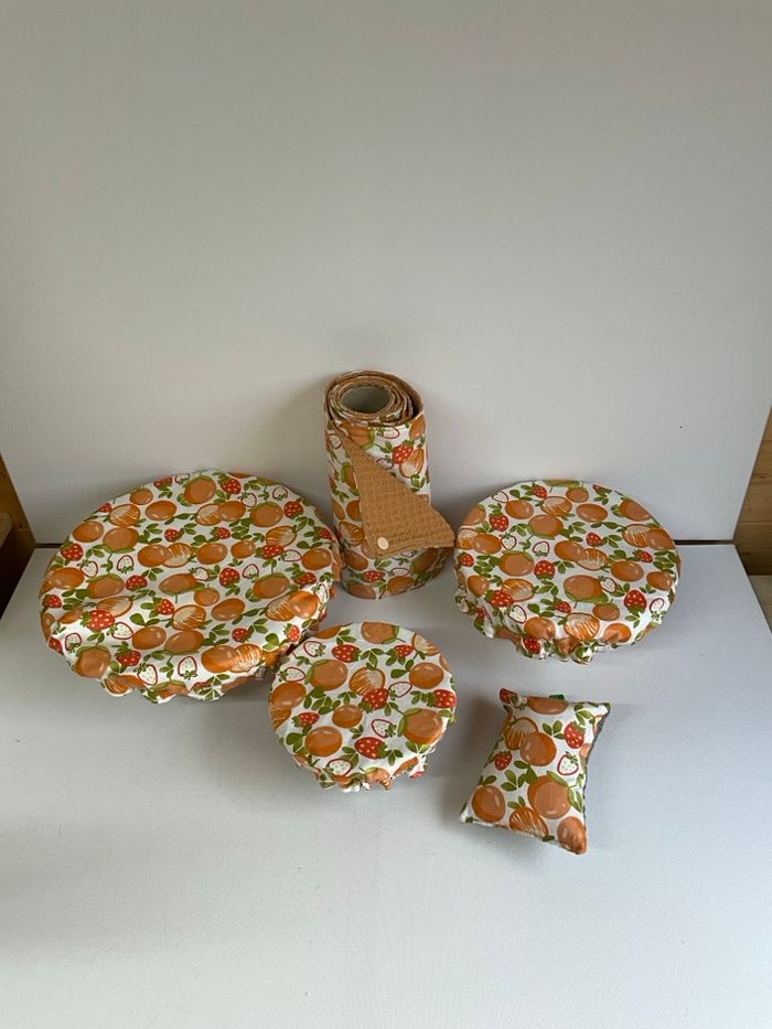Ensemble de cuisine alternative écologique : 1 rouleau de 6 feuilles essuie tout lavable et réutilisable. Feuille environ 22x22 cm en tissu imprimé et éponge nid abeille pour plus d absorption. Les feuilles sont reliées entre elles par des pressions . 3 charlottes couvre plat 100% coton ( diam 18 cm pour les bols, 24 cm pour saladiers moyens et 32 cm pour grands saladiers ou plat à tarte ) . 1 éponge multi usage. Le tout lavable en machine à 40° et réutilisable.