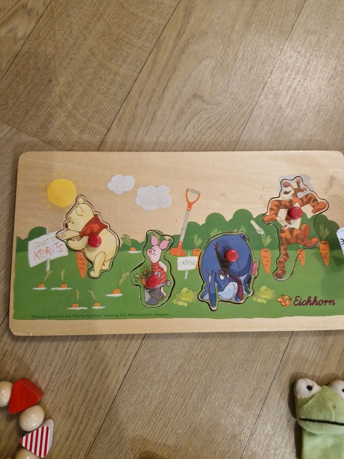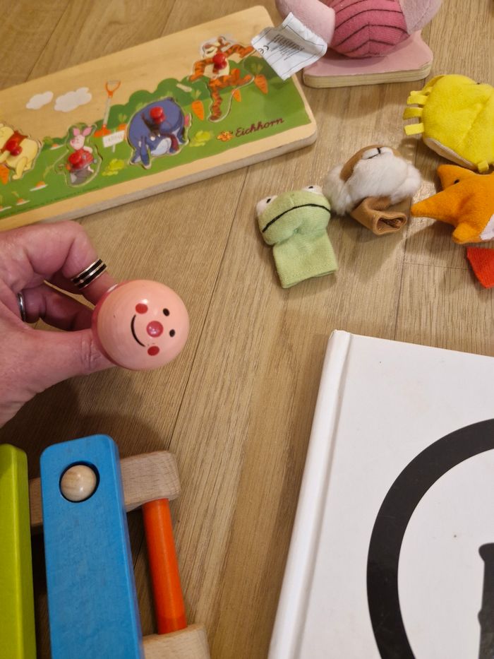 Lot de jouets 1er âge : - 6 marionnettes de doigt (poisson, crabe, tortue, grenouille, lion et étoile) - 1 Maracas en bois - 1 bracelet d'éveil avec grelot, marque Heimess - 1 xylophone en bois, marque Goki - 1 puzzle en bois avec 4 pièces avec picot sur le thème de Winnie l'ourson Disney et un livre peluche de Porcinet - 4 toupies de cire pour commencer à dessiner ! - livre à Rabats sur les fruits, fleurs légumes et petites bêtes, avec les vraies images de fruits sous l'image en noir et blanc, contrastée, parfait pour bébé, puis évolutif Jouets d'occasion en très bon état général, appréciés par ma fille et stockés chez la mamie
