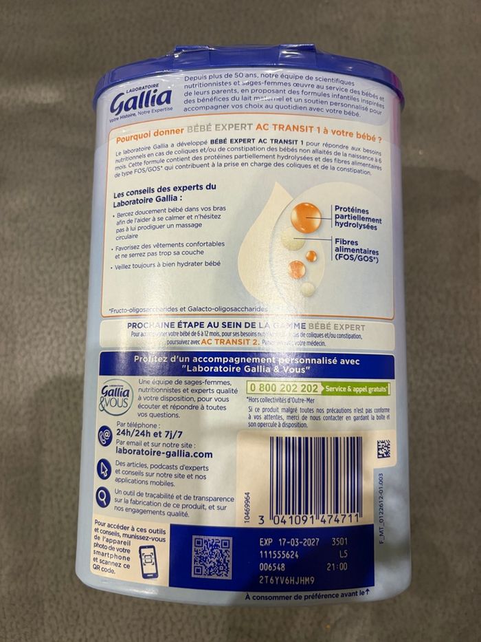 Gallia AC transit neuve 800g Date de péremption 17/03/2027 Nous avons du changé de lait