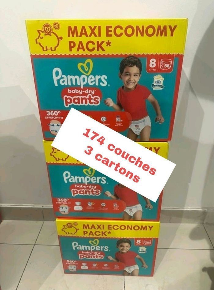174 couches Pampers taille 8 pants+17kg lot de 3 cartons