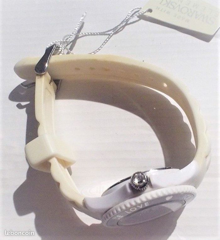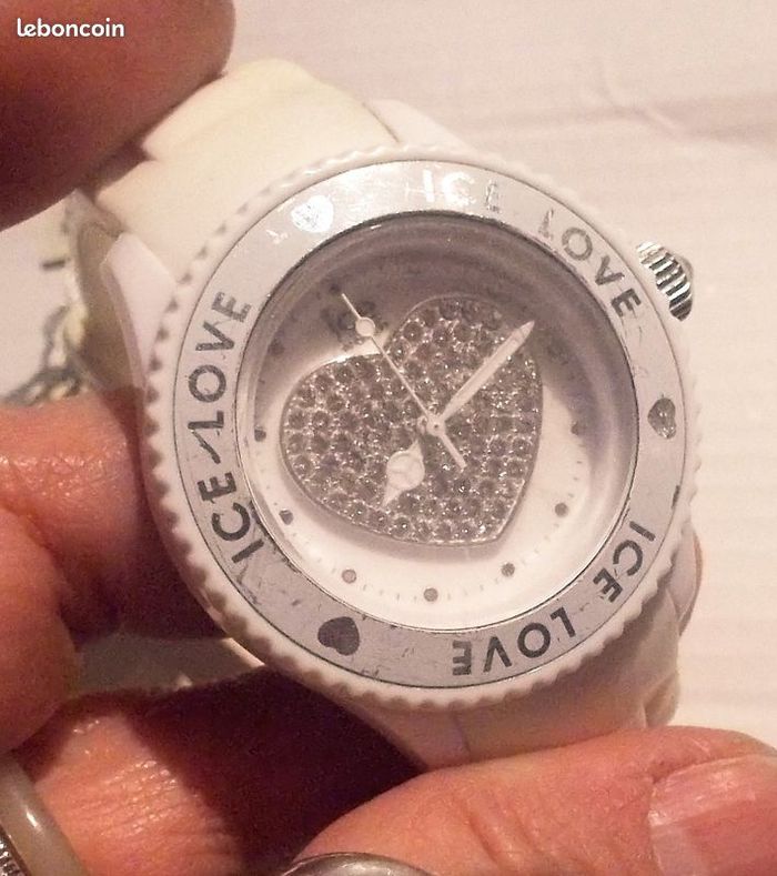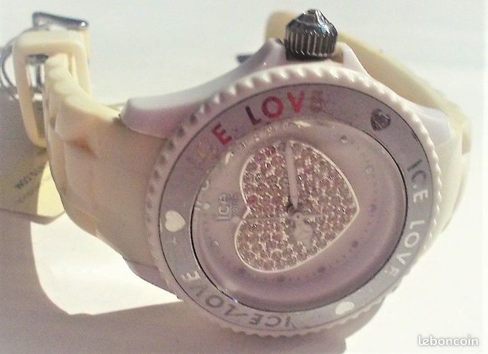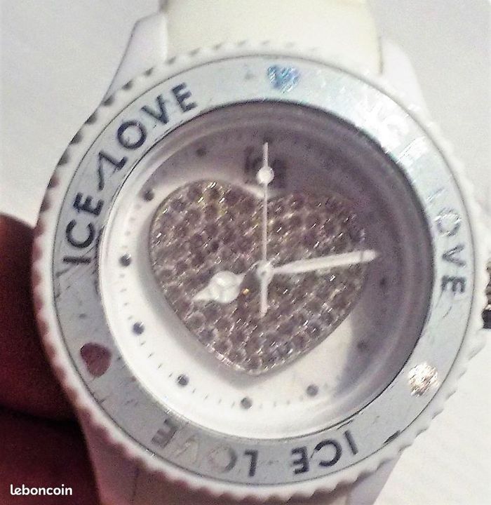 Montre ICE WATCH Original, Collection Love "Ice Love Diams" boîtier couleur blanc de 35 mm à intérieur blanc à cœur serti de cristaux Swarovski, aiguilles blanches et trotteuse blanches, et bracelet en silicone assorti, tbé, fonctionnante, pile fourni, prix définitif.