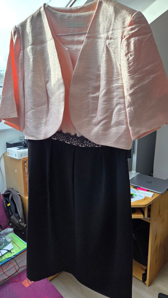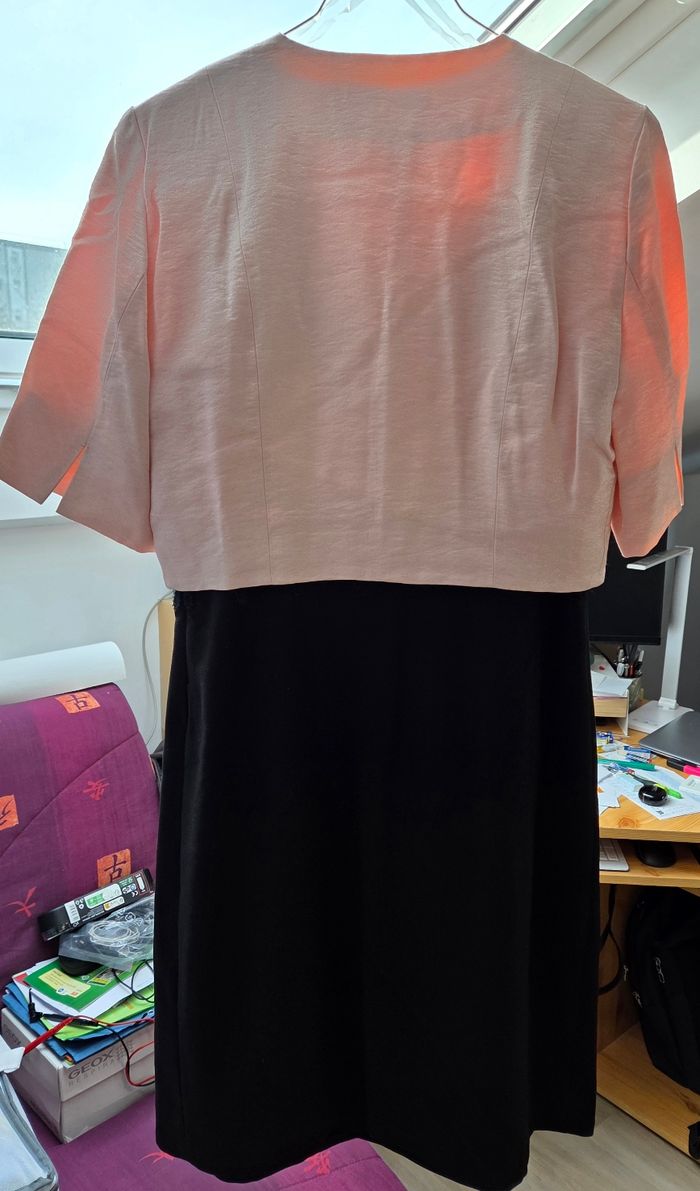Robe de ceremonie manche courte avec un boléro. Colori rose légèrement brillant et noir. Le boléro est doublé. 2 pinces sur le devant de la robe