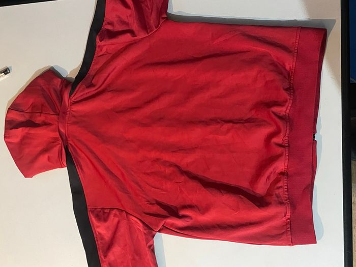 Veste à capuche Nike Sportswear en rouge vif avec fermeture éclair noire. En bon état général avec quelques signes d'usure légers. ⭐️ État : 7/10 (légères traces d'usure) 🎲 Taille : XXXL 🎨 Couleur : Rouge 📦 Livraison rapide et soignée