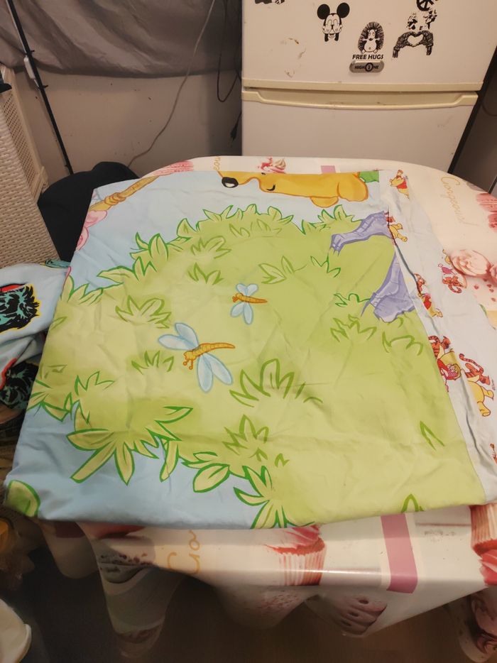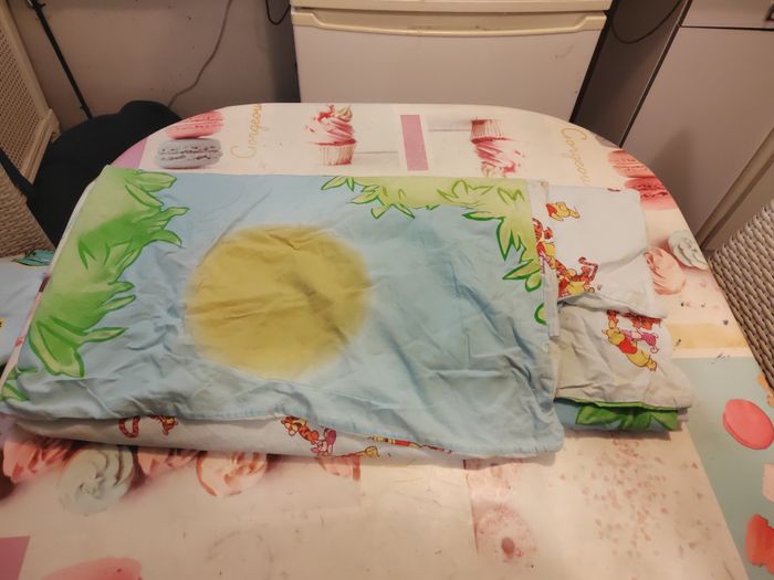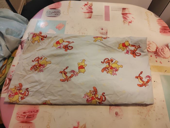 Bonjour je vent ensemble pour lit winie l'ourson il y a 1 t'aies d'oreiller il y a un draps housse et une housse de couette très bonne état en général juste une petite tâche sûr la taie d'oreiller prix 10e