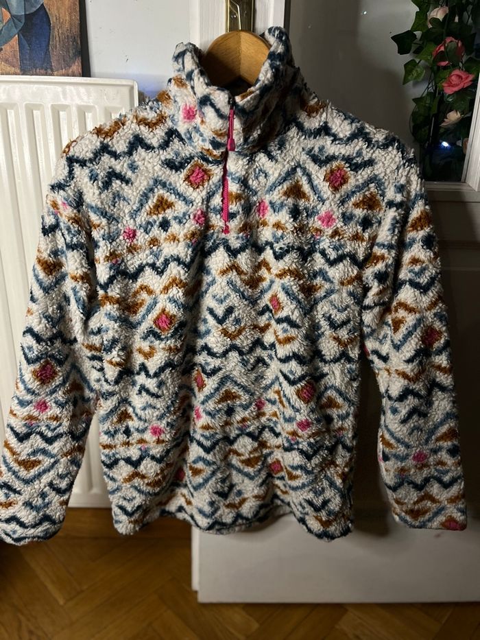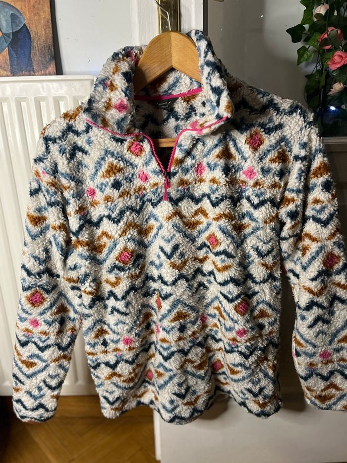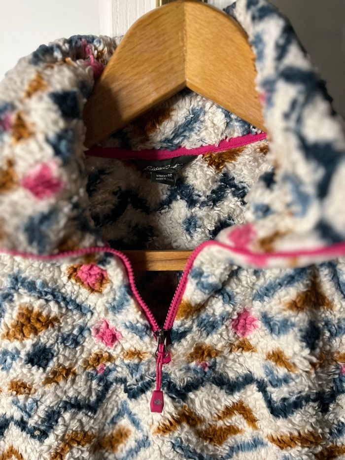 Polaire femme Eddie Bauer Couleur blanc rose marron bleu à motif Quart zip col montant Douce et chaude parfaite pour l'hiver / ski Type moumoute / sherpa Taille M Envoi rapide et soigné. D'autres articles de marques dans le dressing. N'hésitez pas à faire des lots pour obtenir une réduction ou de me la demander 😉 #eddiebauer #polaire #sherpa #pullpolaire #vestechaude #tailleM #modefemme #lookhiver #outdoorstyle #vintagewear #casualstyle #motifethnique #streetwearfemme #vetementfemme #secondeMain #bonplan #tendance #ziprose #hiver2026 #cozyvibes #vetementchaud #mountainstyle #lookautomne #fashiondeal