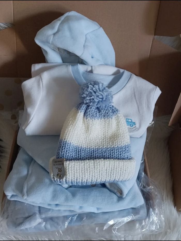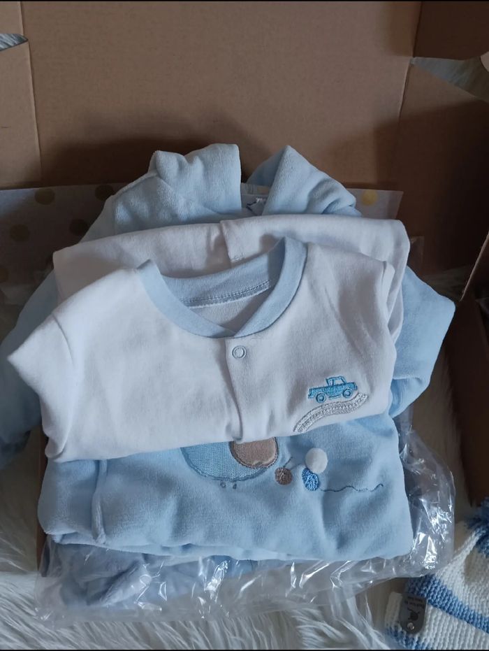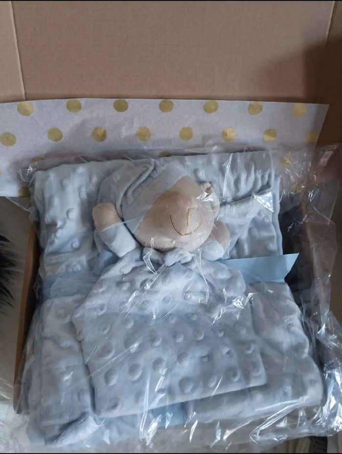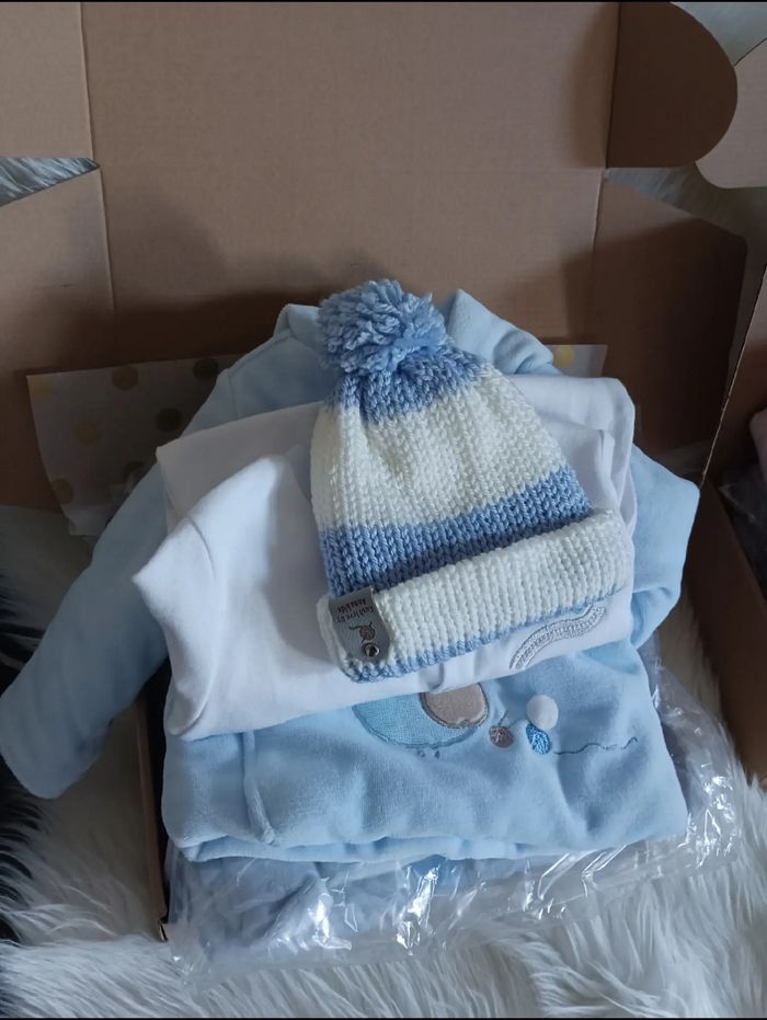 Box naissance comprenant Un manteau bébé 1/3 mois Une grenouillère 0/3 mois Une attache tétine Un bonnet Un gant Une couverture 110*84 Un doudou
