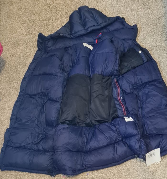 Doudoune Chevignon taille L. Neuve avec étiquette (jamais portée). Couleur bleu marine, très chaude. Capuche intégrée et fermeture zip. État impeccable.