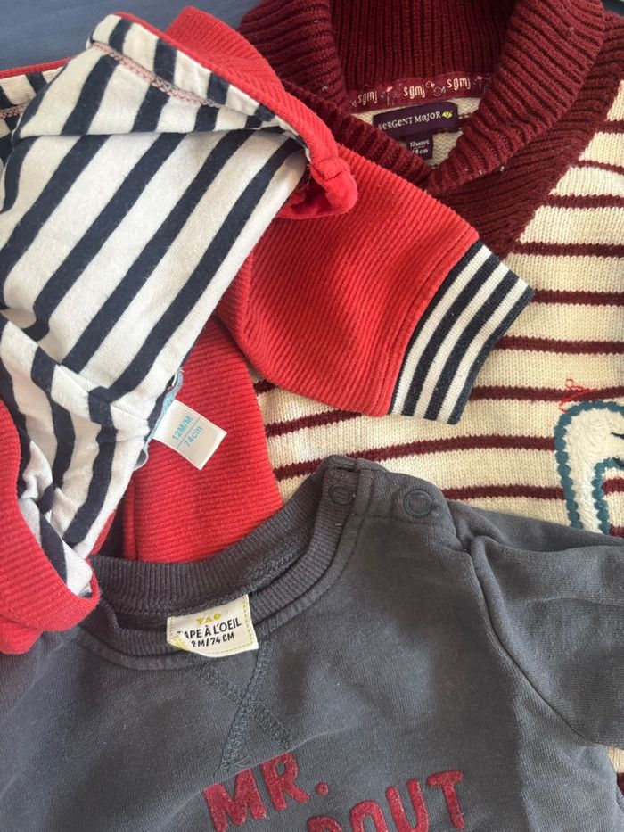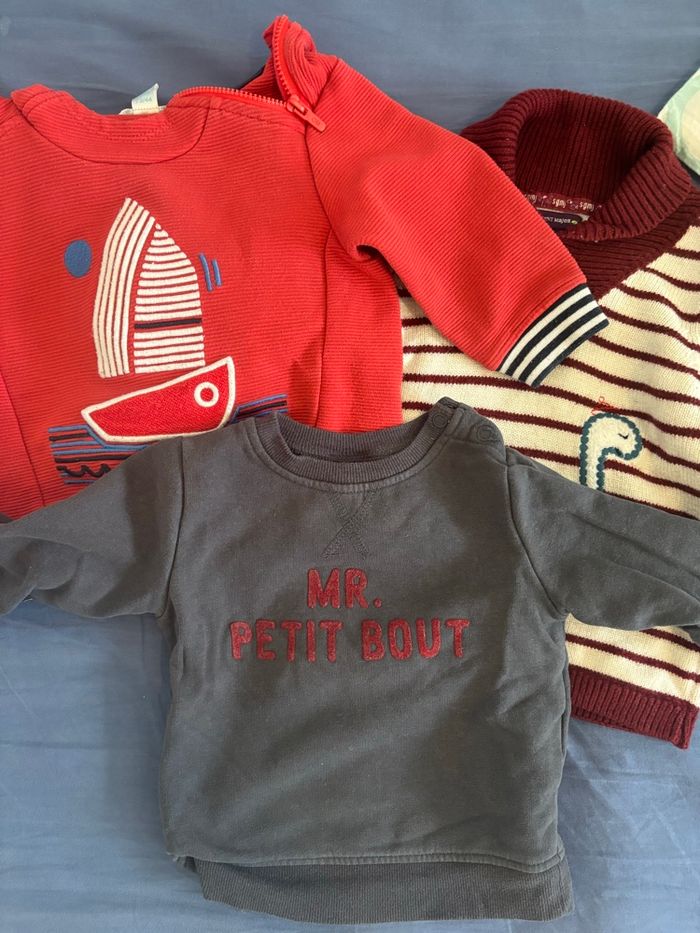 Dans se lot il y’a 1 ensemble sergent major en 9mois 3pull obaibi, sergent major et tape a l’œil en 12mois 1 veste sans manche en 9mois Le tout en bonne état 😊