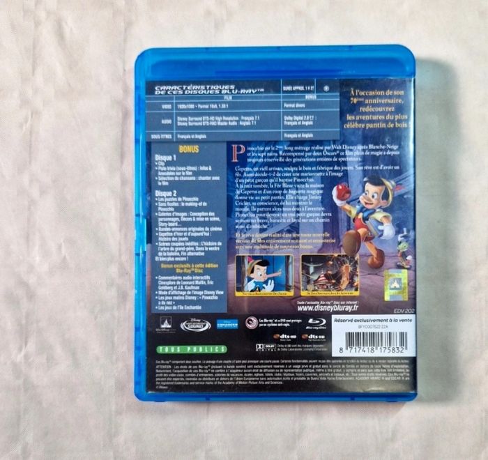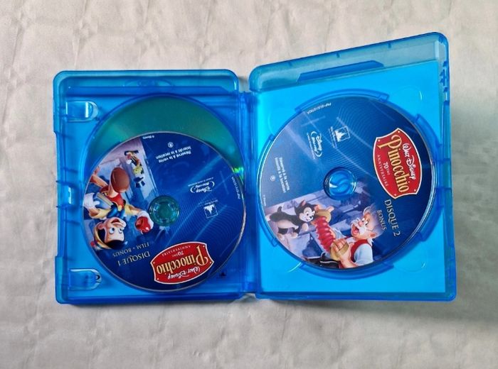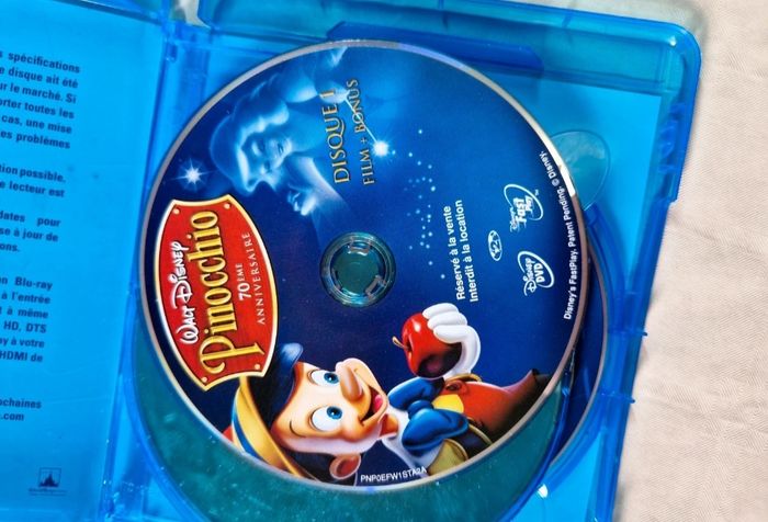 Bonjour, ​Je propose ce chef-d'œuvre d'animation Disney en édition spéciale 70ème anniversaire. ​Détails de l'objet : ​Contenu : Le film "Pinocchio" en combo Blu-ray + DVD. ​État physique : Le boîtier bleu est en bon état. Le disque DVD présente des rayures visibles en photo qui ne gênent pas la lecture. Les disques Blu-ray (film et bonus) sont en très bon état. ​Complétude : Complet avec son boîtier et ses 3 disques (Disque 1 Blu-ray, Disque 2 Blu-ray Bonus, et le DVD du film). ​ #Disney #Pinocchio #Animation #BluRay #Collector #Culte