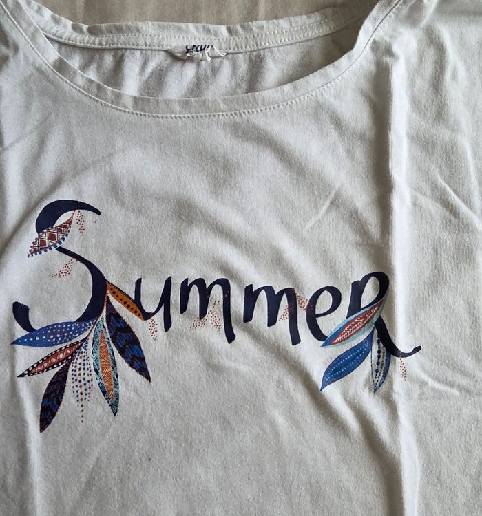 ​✨ ÉTAT : Très bon état. Le blanc est bien conservé et le motif "Summer" est intact, sans craquelures. ​📏 TAILLE & COUPE : Taille S. Coupe fluide et légère, idéale pour les journées ensoleillées. ​🌿 MATIÈRE : 60% Coton, 40% Polyester. Un mélange doux et respirant avec de jolis détails brodés au niveau des emmanchures. ​📦 LIVRAISON : Envoi via Mondial Relay (lockers), Shop2Shop ou Chronopost (point relais physique). ​🎁 Réductions sur les lots activées pour se faire plaisir à petit prix !