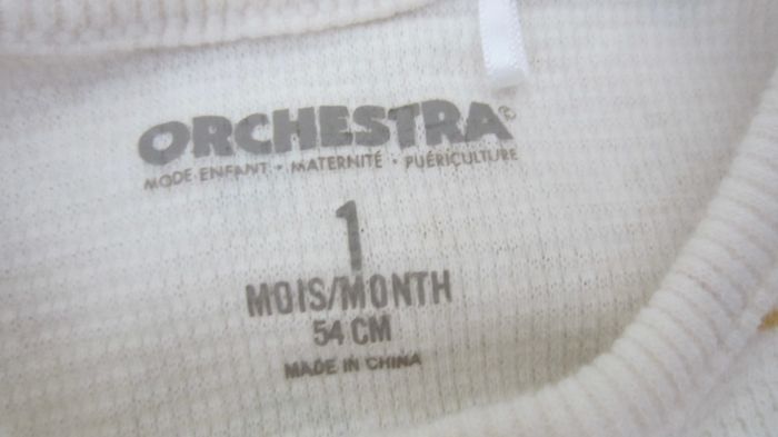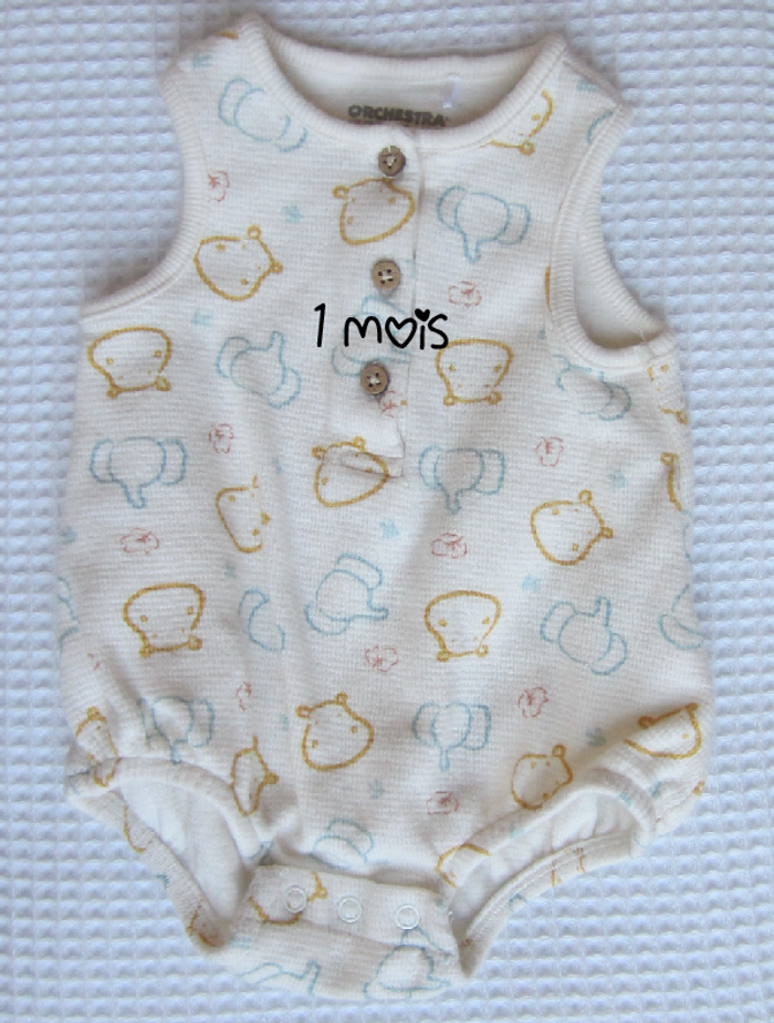 Barboteuse sans manches. Encolure ronde. Effet nid d'abeille. Imprimés contrastés éléphants et hippopotames all-over. Fine patte de boutonnage à l'avant. Ouverture pressionnée à l'entrejambe. Cuisses élastiquées. 95% coton bio, 5% élasthanne. Taille 1 mois. Marque Orchestra.