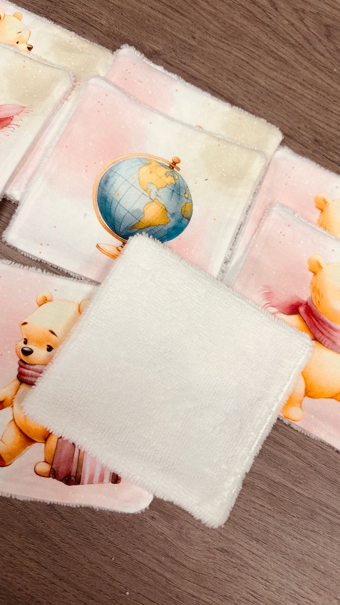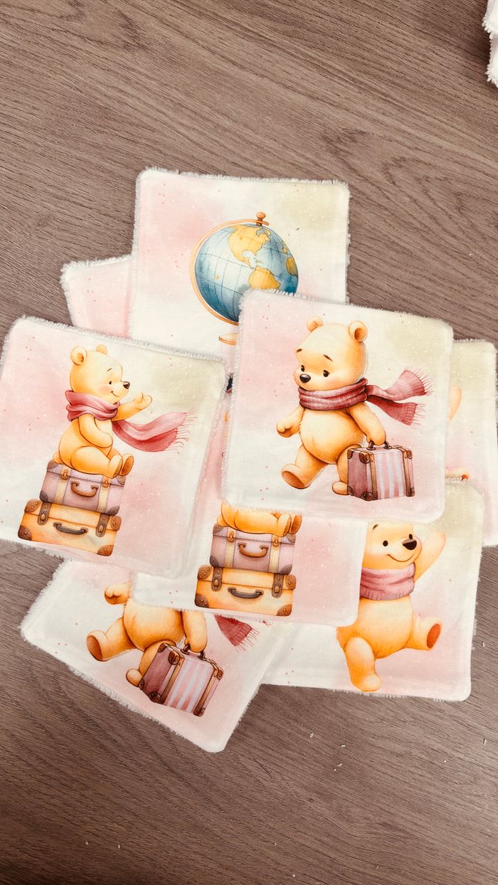 🧸🌍 Lot de lingettes lavables – Thème Winnie l’ourson voyage 🧳✨ Adorables lingettes lavables faites main, avec un tendre motif petit ourson aventurier, valises et globe tout en douceur 🤍 Confectionnées avec une face imprimée toute douce et une face en éponge de bambou 🌿 ✨ Idéales pour : – Le change de bébé – Le nettoyage du visage et des petites mains – Le démaquillage de maman – Un cadeau de naissance original et utile 🌼 Douces pour la peau 🌼 Réutilisables et écologiques 🌼 Économiques et durables 🌼 Lavables en machine Un indispensable du quotidien, pratique et plein de tendresse 🧸 Envoi rapide et soigné 📦 N’hésite pas à me contacter pour toute question ou demande personnalisée 😊