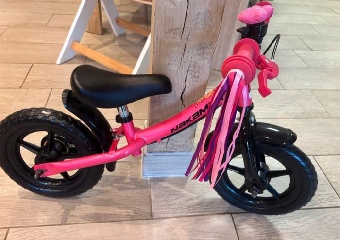 Draisienne toute équipée Nakamura Luna ! Un vélo pour apprendre sans pédales. De 85 à 105 cm (dès 2 ans). Détails produits : Guidon et selle ajustables en hauteur Roues de 12 pouces pour gagner en stabilité et faciliter l'apprentisage de l'équilibre Frein arrière adapté aux petites mains Pneus increvables en mousse EVA ! Dès 2 ans (De 85cm à 105cm) Neuve jamais utilisée Vendu avec frange et klaxonne