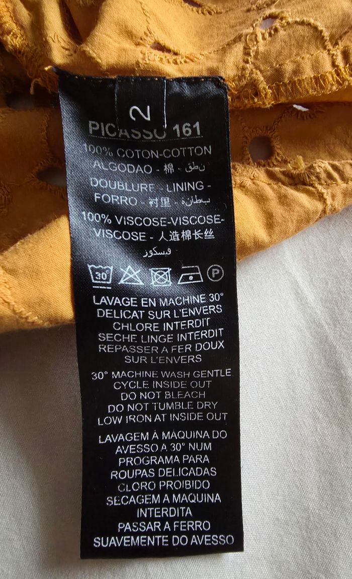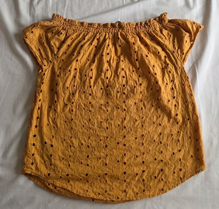 ​✨ ÉTAT : Très bon état. Les broderies sont intactes, la couleur moutarde est toujours aussi vibrante et il n'y a aucun défaut à signaler. ​📏 TAILLE & COUPE : Taille 2 (correspond à un M/38). Coupe fluide avec une encolure élastiquée type "Bardot", permettant de porter le top avec les épaules dénudées ou non selon l'envie. ​🌿 MATIÈRE : 100% Coton pour l'extérieur (broderie anglaise délicate) et doublure 100% Viscose pour un confort optimal et une belle opacité. Tissu léger, respirant et très agréable pour les beaux jours. ​📦 LIVRAISON : Envoi via Mondial Relay (lockers), Shop2Shop ou Chronopost (point relais physique). ​🎁 Réductions sur les lots activées ! C'est le moment de jeter un œil à mon dressing pour optimiser les frais de port.