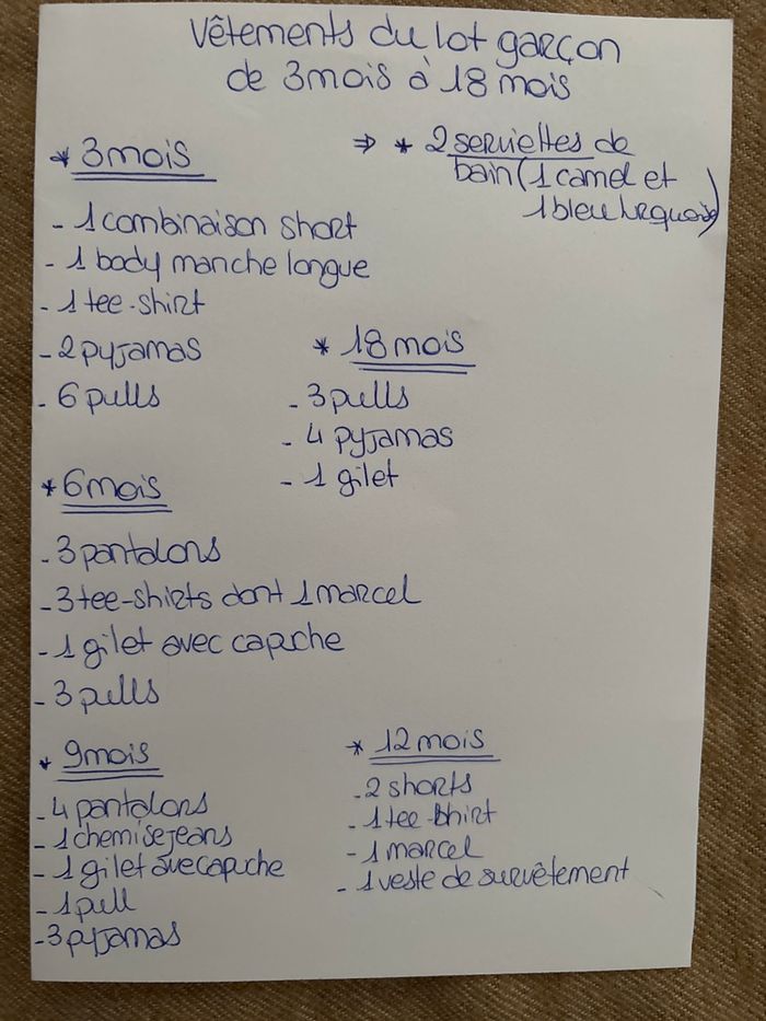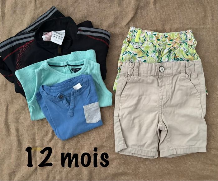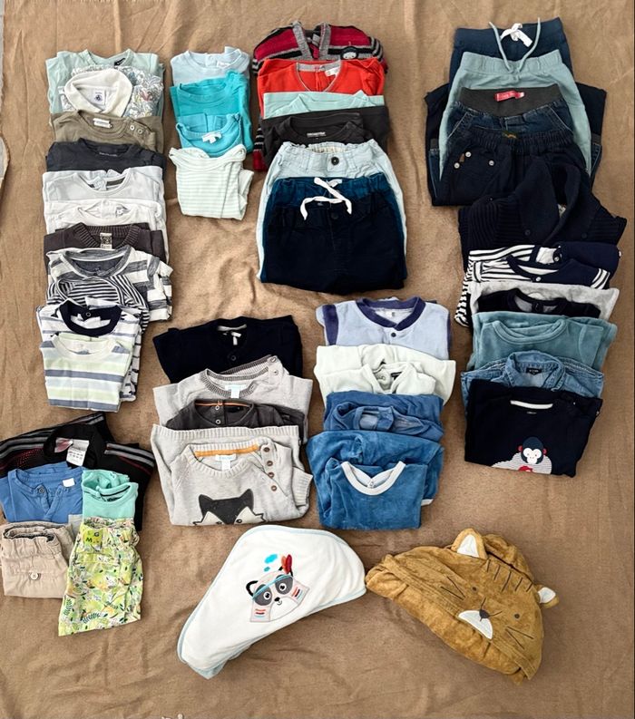 Lot garçon de 3 à 18 mois Possible de prendre une seule tranche d’âge ou faire des modifications du lot Différentes marques : Timberland, Kiabi, adidas, obaibi, tape à l’œil … La liste du lot figure sur la photo 2
