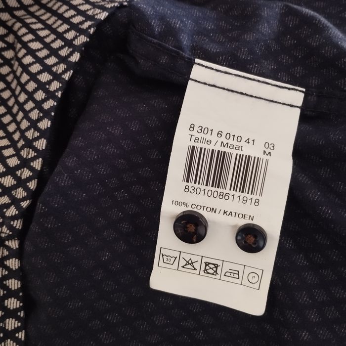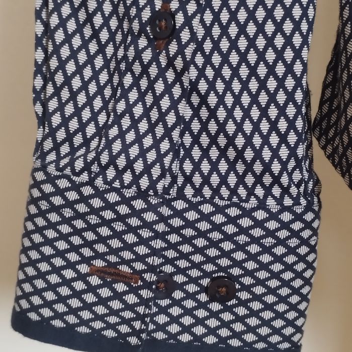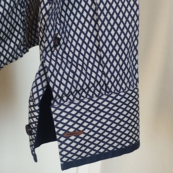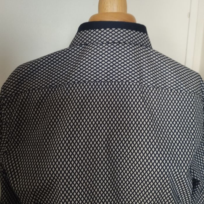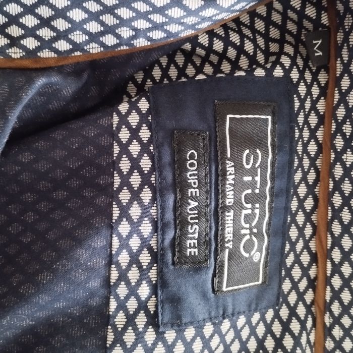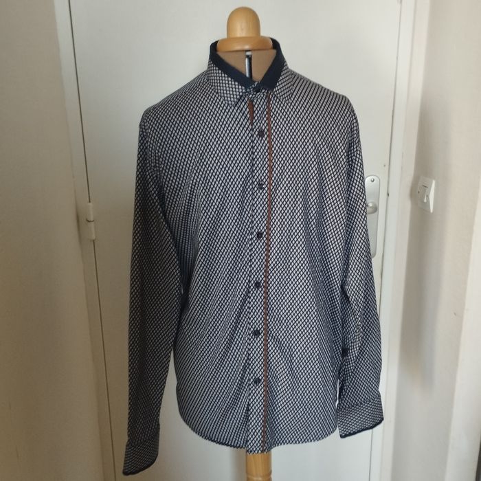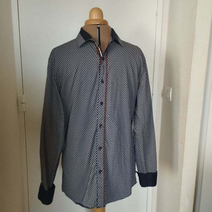 Chemise Homme de chez Armand Thierry. Bleu marine foncé et gris. Patte boutonnage à l'avant avec une finition liseré marron. Epaule 42. Aisselle 51. Longueur 70. Très peu porté comme neuf !