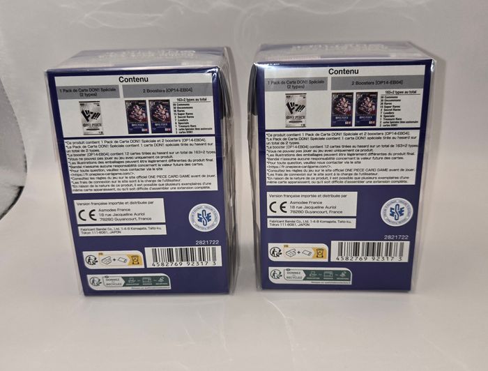 Lot de 2 One Piece Card Game OP14 Booster Double Pack (8) Version Française Produit NEUF jamais déballé. Ce lot comprend deux unités de Double Packs scellés issus de l'extension OP14 du jeu de cartes One Piece (TCG). Chaque Double Pack contient deux boosters d'extension OP14 ainsi qu'une carte Don! exclusive avec une illustration spéciale. Ces packs sont parfaits pour les collectionneurs et les joueurs cherchant à renforcer leurs decks avec les dernières cartes de la méta en version française. Les scellés d'origine sont parfaitement intacts. Prix pour le lot de 2 unités : 45€ (Prix total pour les deux packs). SÉCURITÉ ET EXPÉDITION : - Expédition soignée garantie sous 24H. - Pour prévenir toute tentative d'arnaque ou litige abusif, l'intégralité du processus de préparation du colis (mise en boîte) ainsi que le dépôt au point d'envoi seront filmés et horodatés. DÉTAILS TECHNIQUES : - Dimensions d'un pack : Environ 18 x 8 x 3 cm - Contenu par unité : 2 Boosters OP14 + 1 Carte Don! exclusive - Langue : Français (FR) - Éditeur : Bandai - Référence : OP14 Booster Double Pack (8) #OnePiece #OnePieceTCG #OP14 #DoublePack #CartesOnePiece #CollectionOnePiece #TCG #JeuxDeCartes #Manga #Anime #Luffy #Zoro #Nami #BoosterOnePiece #PokemonTCG #Neuf #Scelle #RareCards #Holographique #VenteOnePiece #OnePieceFan #Otaku #Geek #Investissement #CartesACollectionner #BandaiNamco #Nakama #GrandLine #ShonenJump #EiichiroOda #LuffyFan #JCC #JeuxDeSociete #CartesPromo #MangaArt #OnePiece2026 #Collectionneur #TradingCardGame #LuffyVibe #GumGumFruit #Treasure #LuffyCollector #PackOnePiece #OnePieceFrance #TCGFrance #JCCFrançais #DonCard #JeuxDeCartesACollectionner #MangaFan #Bandai