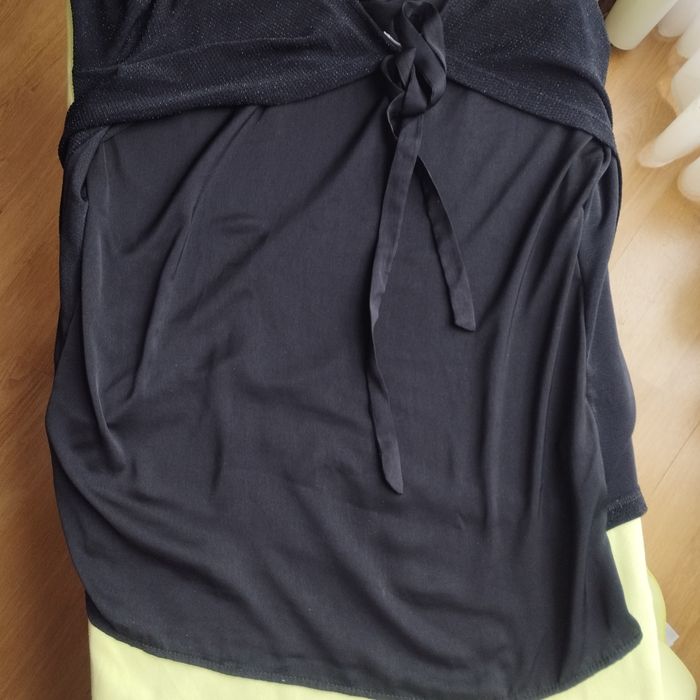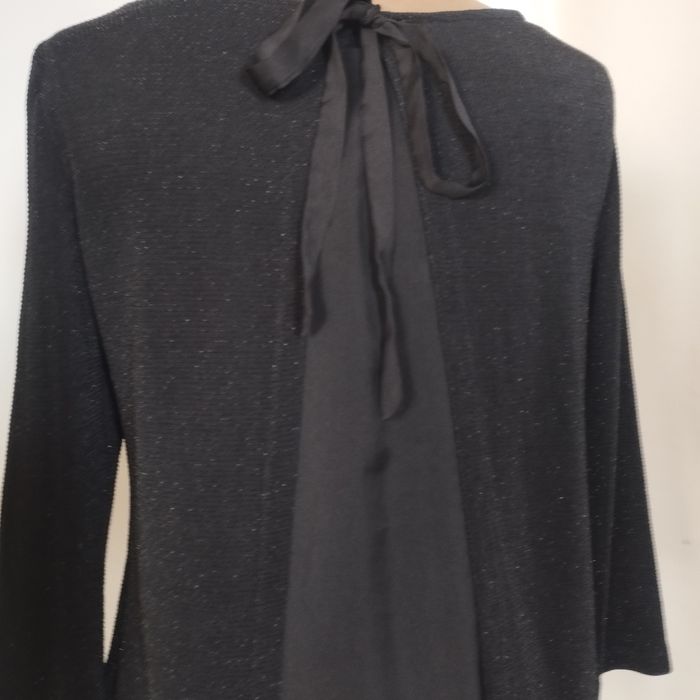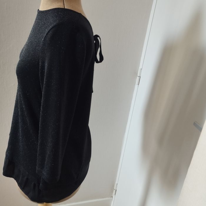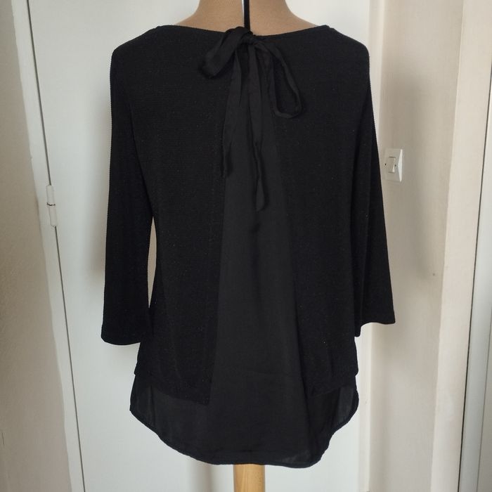 Très joli haut pour femme de chez Promod. Taille M 38 Hauteur62cm. Devant matière polyamide , fibre métal, élasthanne (effet perlé) et bas tissus . A l'arrière tissus polyester avec un long ruban à nouer. Manches 3/4.