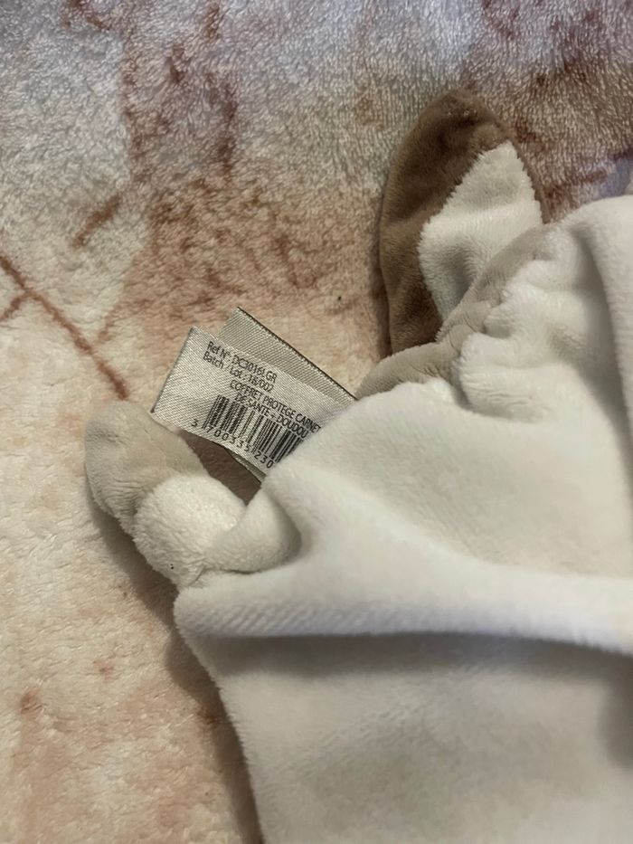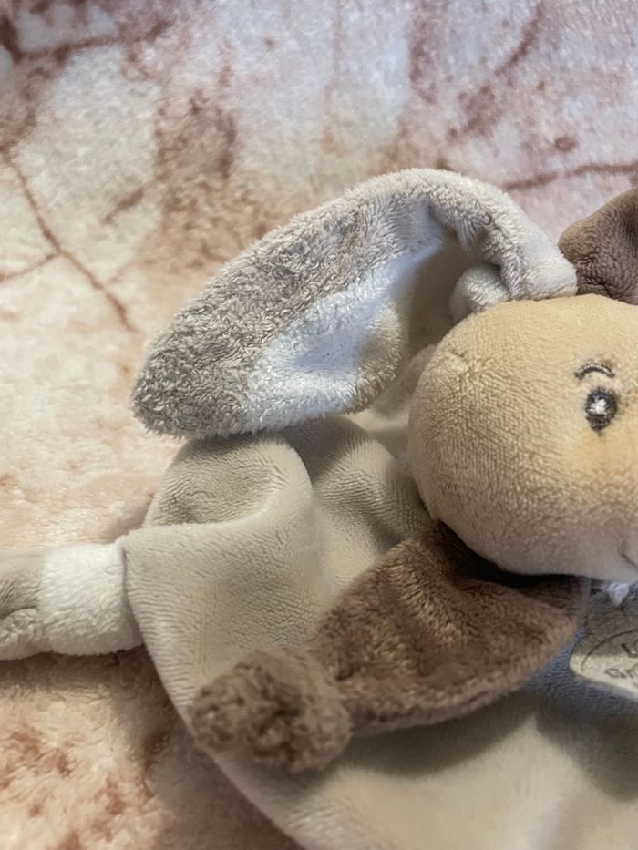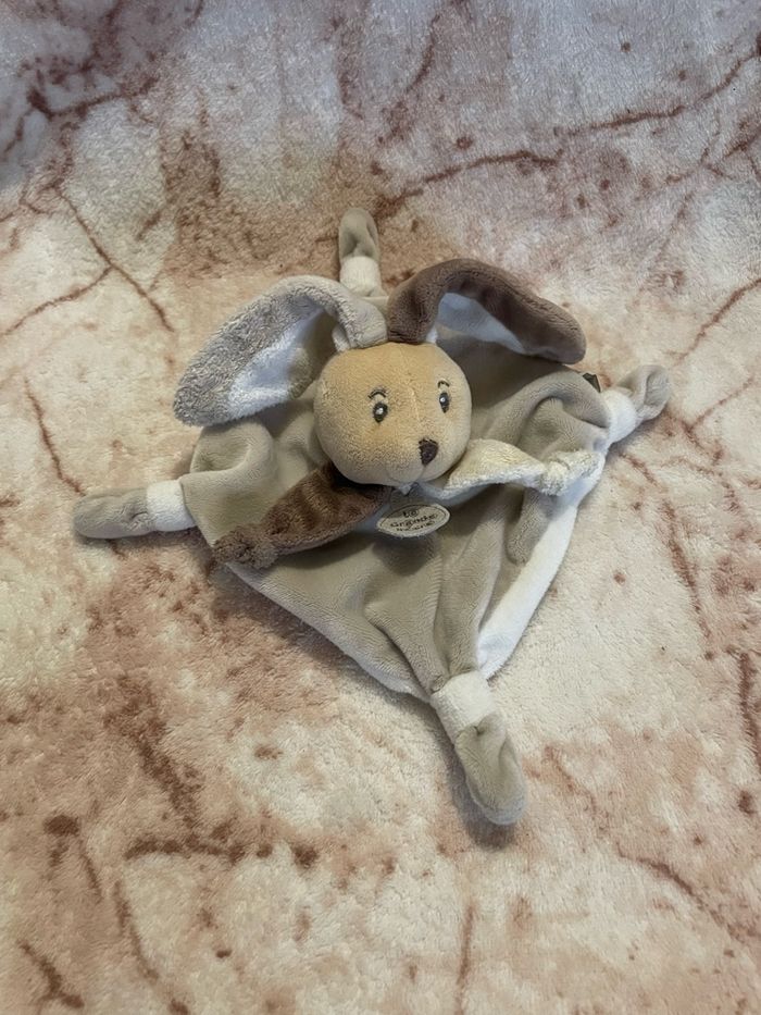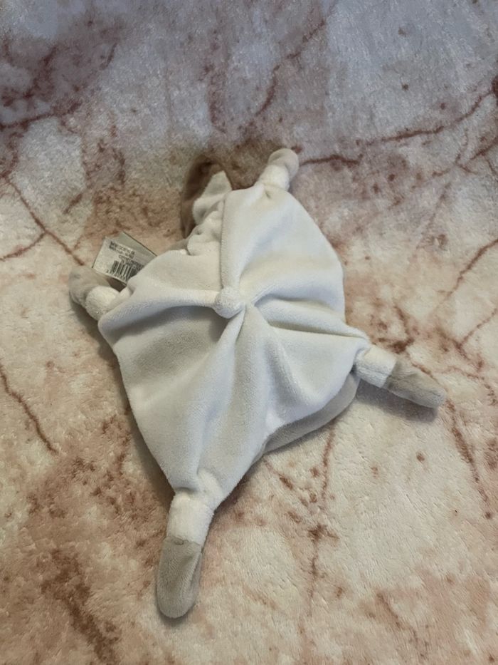 Doudou plat mini lapin blanc beige marron taupe 4 noeuds aux extrémités +/- 14cm Réf : DC3016LGR La Grande Récré Occasion bon état ( ⚠️ une oreille un peu plus usée voir la photo) Vous achetez le doudou que vous voyez sur la photo