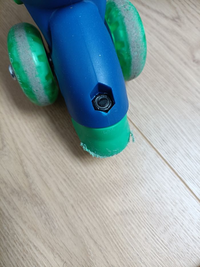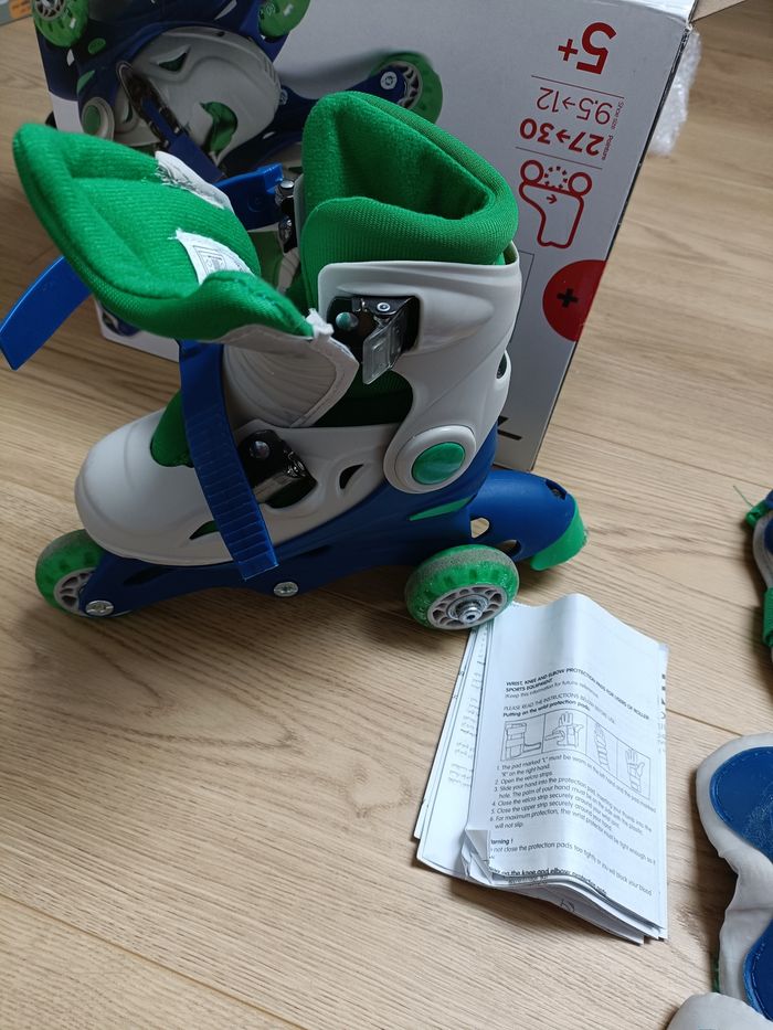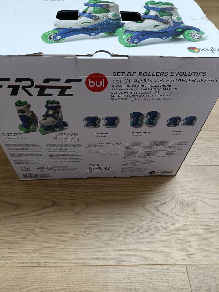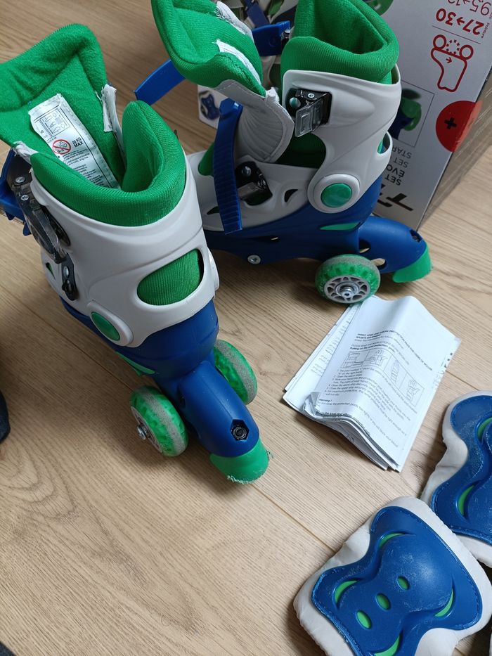 Patins à roulettes évolutifs. 3 roues pouvant se mettre une devant, deux derrières ou en ligne. Protections vendues avec mais usées. Scratches fonctionnels. Matériel pour adapter les roues inclus. Notices inclues. Fonctionnel mais usé surtout au niveau des protections, des roues et l'arrière (frein).