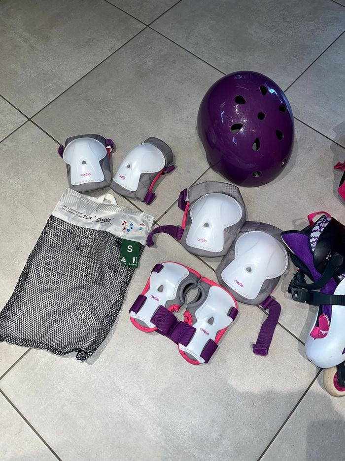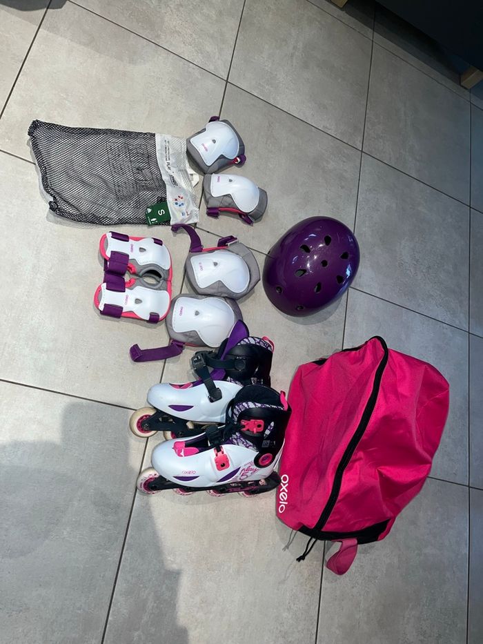 Je vends un ensemble complet de rollers enfant, idéal pour débuter ou continuer en toute sécurité. 🔹 1 paire de rollers en ligne Oxelo – taille 34/36 🔹 Set de protections taille S (poignets, genoux, coudes) 🔹 Casque Oxelo taille M réglable 🔹 Sac de rangement Oxelo 👉 L’ensemble est en bon état et parfaitement fonctionnel. Les rollers ont été utilisés en extérieur, donc il y a des traces d’usage (rayures superficielles normales liées à la pratique). Rien qui n’empêche leur bon fonctionnement. Le matériel est propre et prêt à être utilisé.