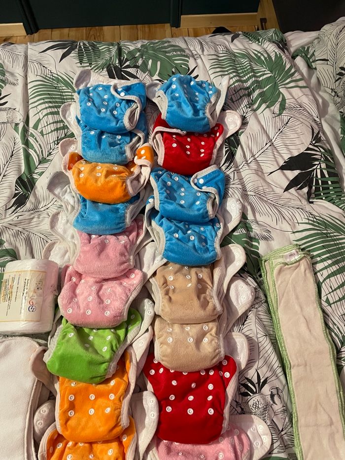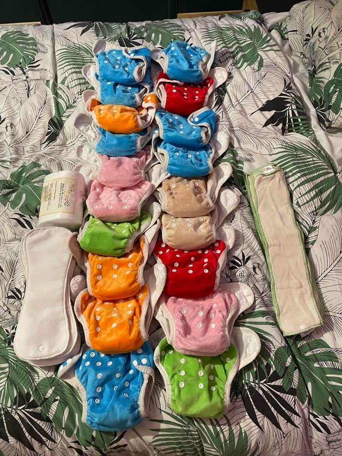Gros lots de couche lavable utilisé mais sont en très bon état Il comprend : - 19 couches - 19 insert - 1 rouleau de 100 voile neuf - 8 inserts épaisse - 7inserts super