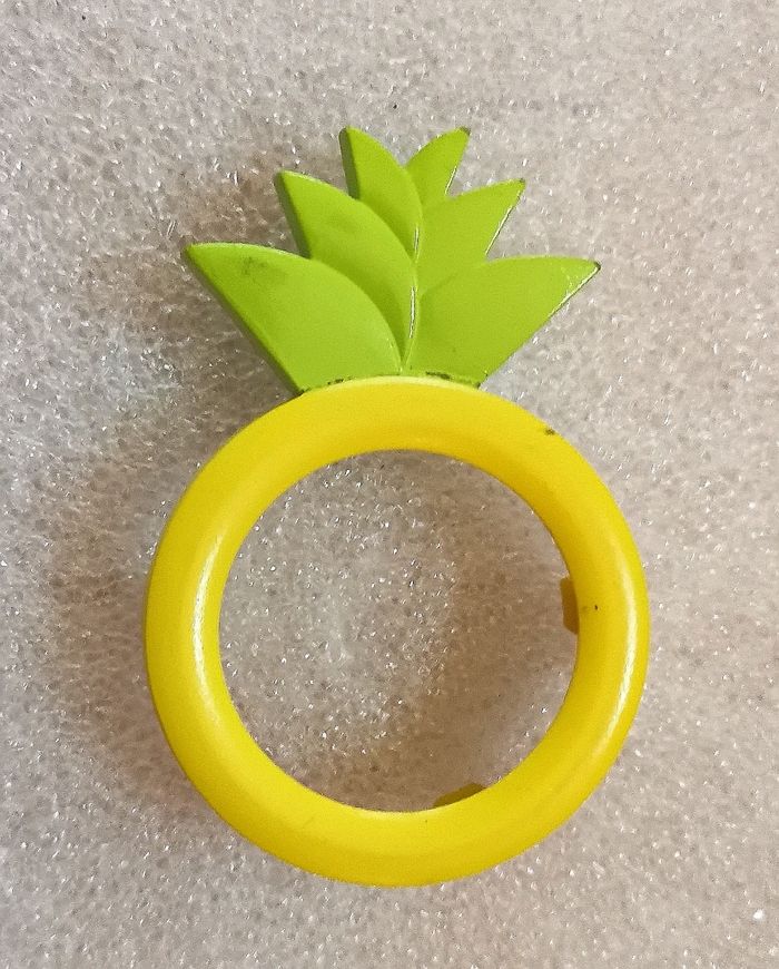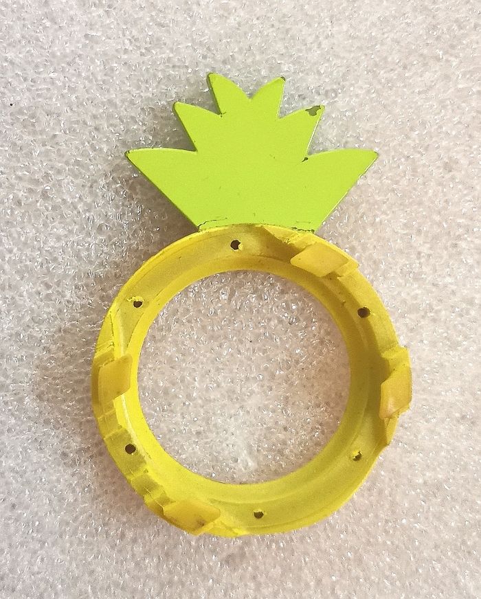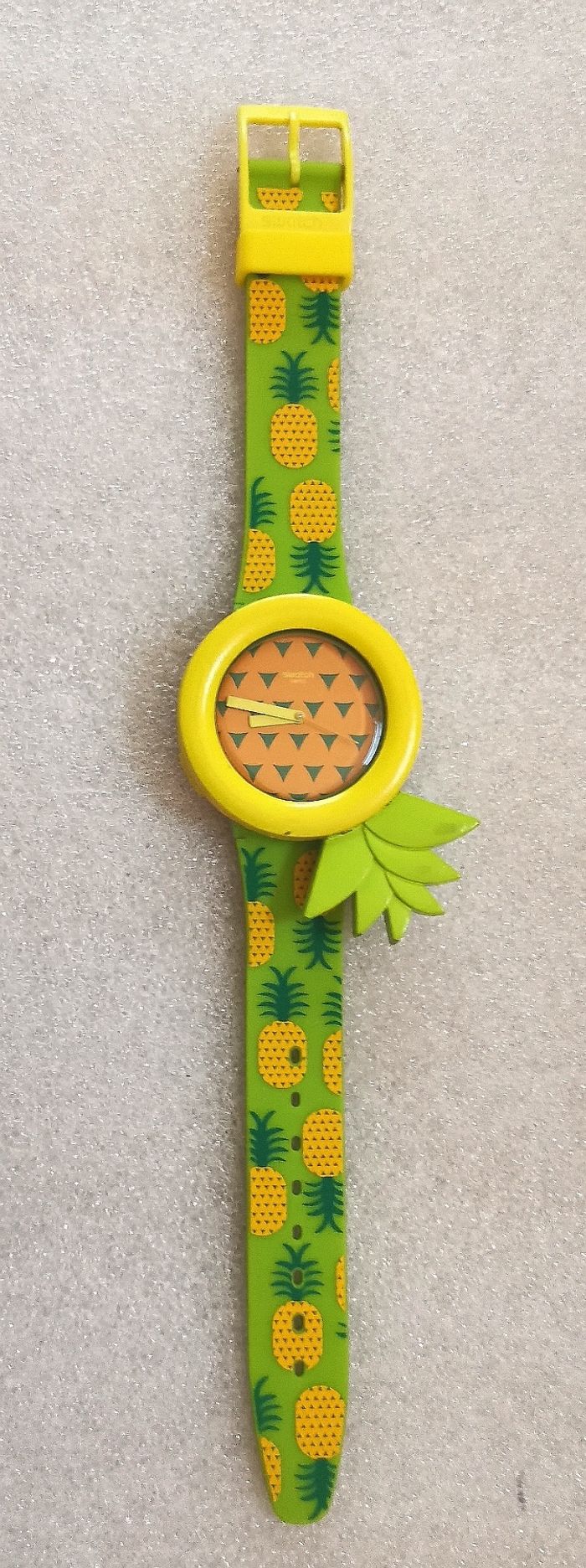 Montre Collecteur SWATCH "Exotic Button" GG 218, Collection Gents, boitier de 33 mm à intérieur jaune et vert, aiguilles jaunes et trotteuse orange et bracelet en résine à motifs assorti, tbé, fonctionnante, pile fourni, vendu avec son clip ananas, , prix définitif.