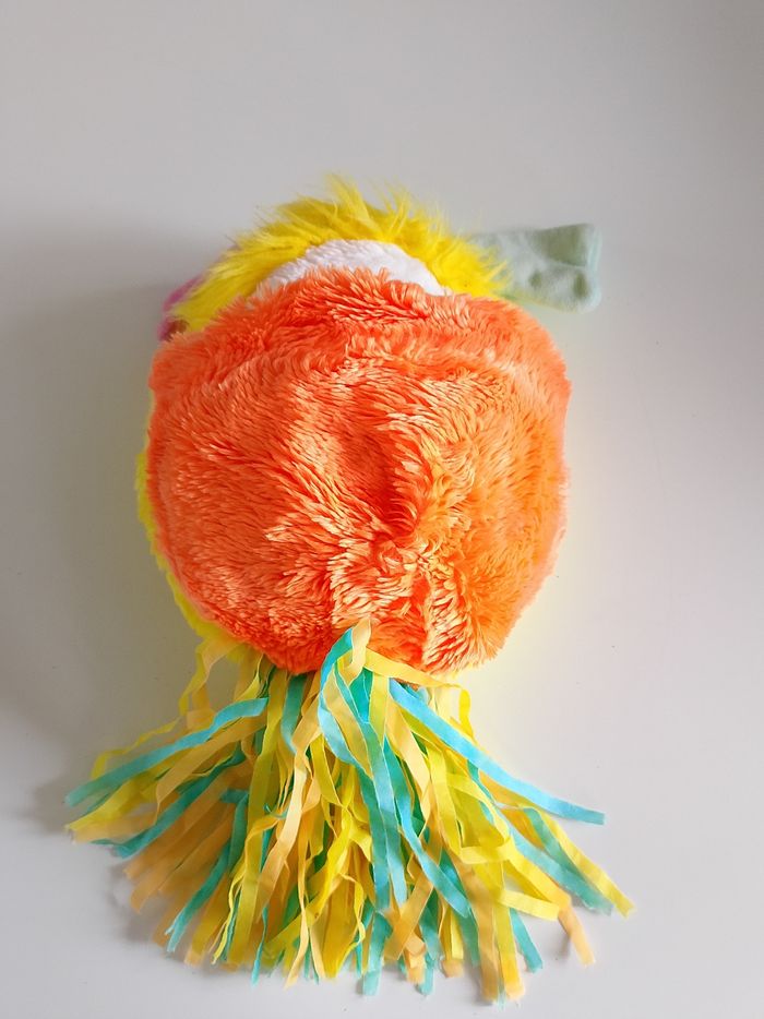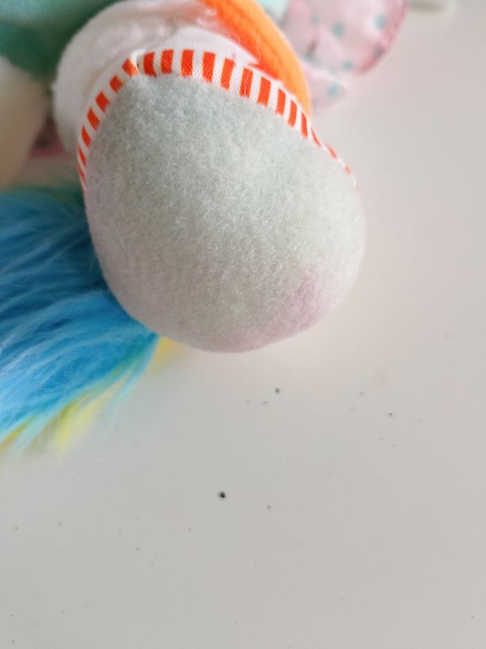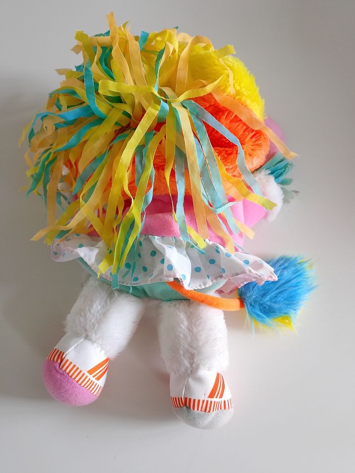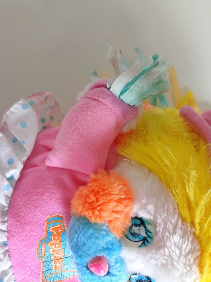 Bon état Étiquette effacée Transfert de couleur rose sur la jupe Les yeux un peu effacés Décoloration des franges bleues