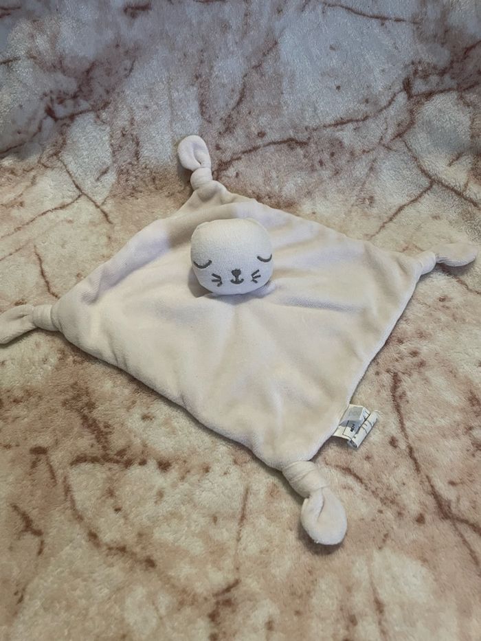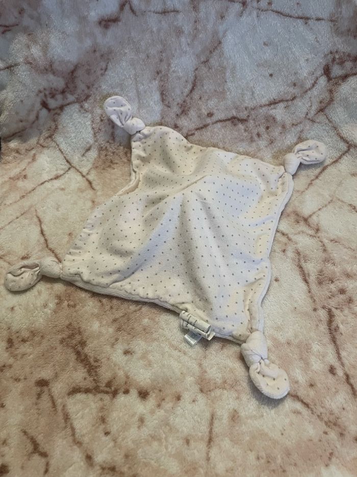 Doudou plat chat rose poudré Au dos des motifs à pois gris 4 noeuds aux extrémités Bout’chou Monoprix Occasion en très bon état Vous achetez le doudou que vous voyez sur la photo