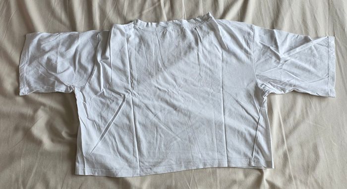​✨ ÉTAT : Très bon état. Le blanc est resté bien éclatant, aucune tache ni jaunissement à déplorer. ​📏 TAILLE & COUPE : Taille S. Coupe "crop" (courte) moderne avec des manches confortables, parfait pour un look minimaliste. ​🌿 MATIÈRE : 100% Coton. Un basique de qualité, respirant et agréable à porter directement sur la peau. ​📦 LIVRAISON : Envoi via Mondial Relay (lockers), Shop2Shop ou Chronopost (point relais physique). ​🎁 Réductions sur les lots activées pour se faire plaisir à petit prix !