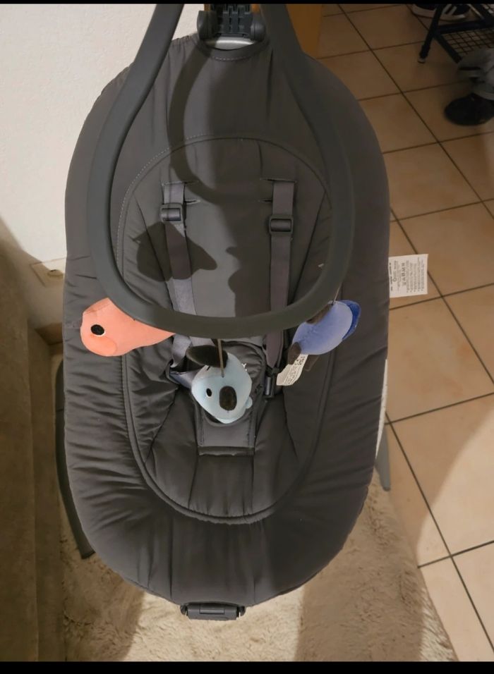 Vends balancelle excellente etat servis jusqu'au 7 mois de bebe. Je m'en débarrasser à contre cœur car déménagement. Assise confortable pour bebe des la naissance. Jai enlevé le coussin blanc quand met au dessus pour naissance. Voir photo sur net. nid design, ergonomique, douillet et relaxant pour apaiser bébé, l'accompagner vers le sommeil et le divertir dès son réveil. SES ATOUTS Pratique et astucieux, son détecteur de mouvements actionne la mise en route du balancement dès que bébé bouge ou se met à pleurer Fonction transat ou balancelle Assise rotative à 360° Dossier 2 positions : position haute (75 cm) pour que bébé s'éveille et participe à la vie de famille durant le repas et position basse (55 cm) Assise (3 positions d'inclinaison) réglables indépendamment d'une seule main Coussin réducteur amovible spécial nouveau-né 2 modes de bercement (avant/arrière ou latéral) + 5 vitesses de balancement programmables par minuterie (10, 20 ou 30 min) 8 musiques ou sons de la nature relaxants avec qualité MP3 et volume du son réglable Adaptateur mini-USB inclus Mobile d'éveil ajustable sur 3 positions Démontable simple, pour la ranger ou l'emporter aisément