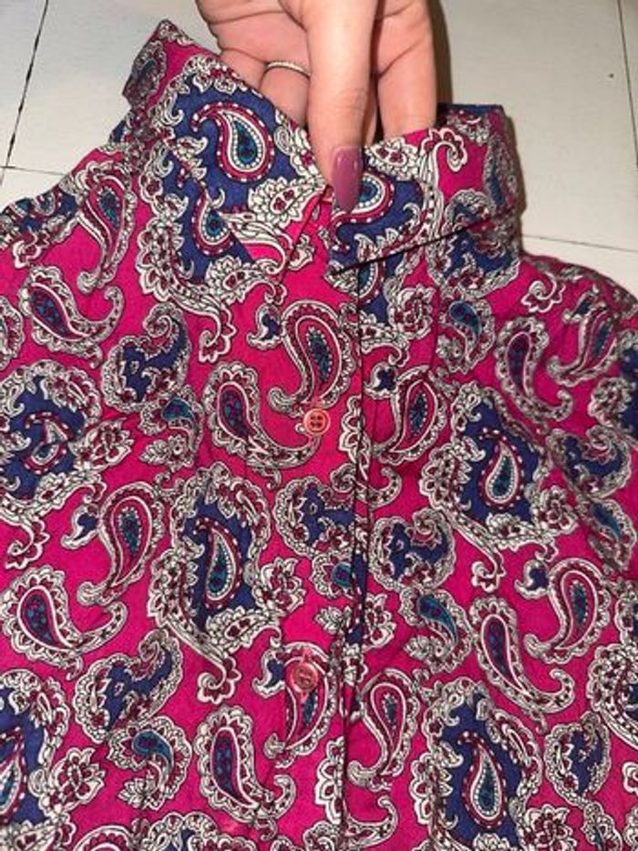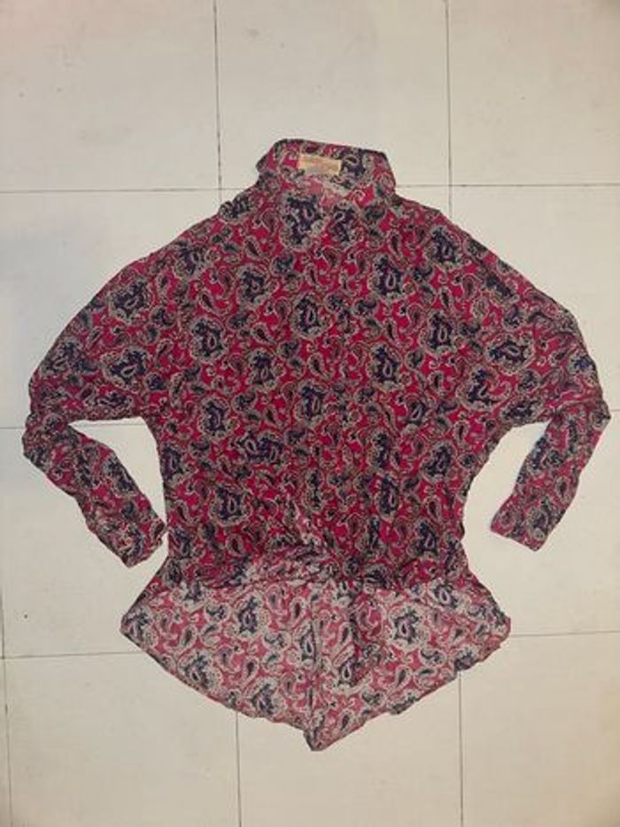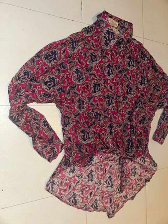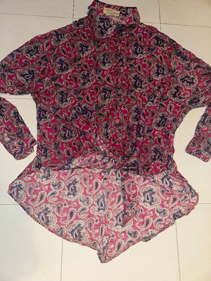 -Sublime chemise, à manches longues, avec boutons d’accroches sur le devant, possibilité de faire un noeud sur le devant comme sur les photos ou de laisser long, parfait pour une tenue avec un jean taille haute. -taille: je ne vois plus du tout la taille sur l’étiquette donc je vous mets mes mensurations: ÉPAULES: 50 cm. AISSELLES: 57 cm. LONGUEUR: 71 cm. -marque: Claude d’Alban. -elle est en très bon état, aucunes taches et aucuns trous. 100% vintage, elle était à ma mamie elle la mettais avec un tee shirt en dessous, comme tunique.