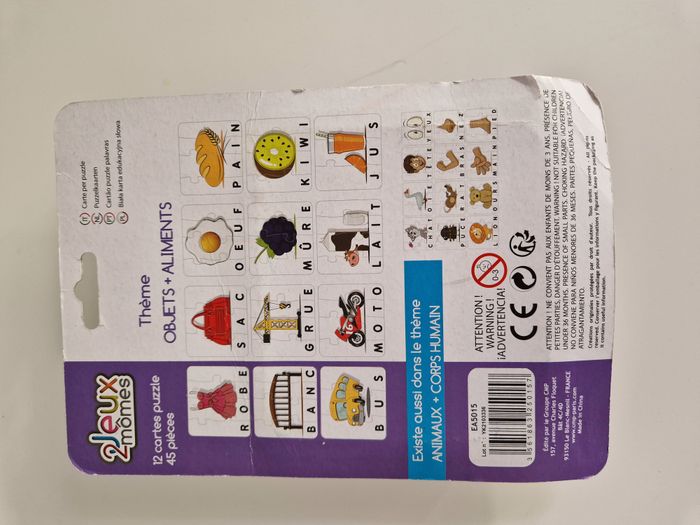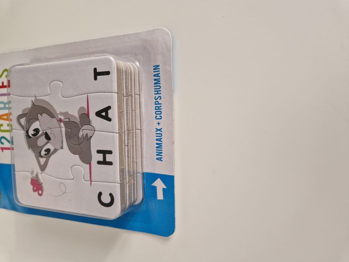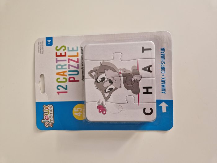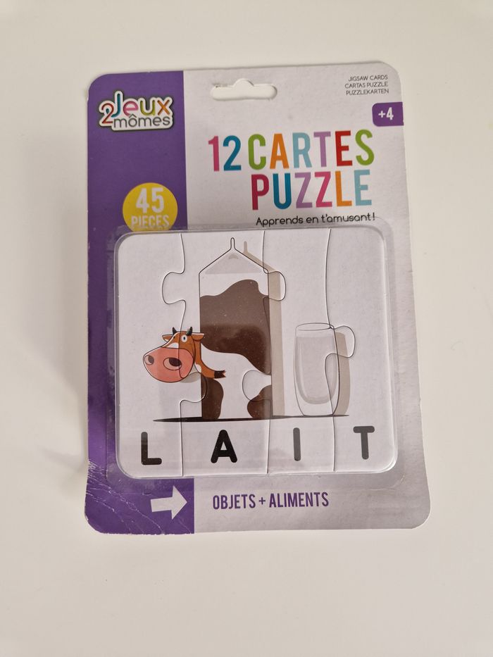 vends un lot de 2 paquets de 12 cartes puzzles chacun dans leur emballage un objetet aliments et l'autre animaux et corps humain je vends d'autres affaires, n'hésitez pas si vous avez des questions , à regarder si besoin