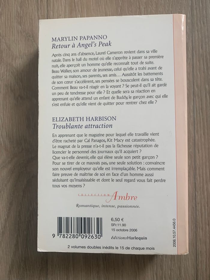 Je vends ce lot de 2 romans Harlequin : "Retour à Angel's Peak" de Marylin Papanno et "Troublante attraction" d'Elizabeth Harbison. - Titre : Retour à Angel's Peak - Auteur : Marylin Papanno - Titre : Troublante attraction et Retour à Angel’s Peak - Auteur : Elizabeth Harbison - Éditeur : Harlequin - Collection Ambre - Genre : Roman Bon état N'hésitez pas à me contacter pour plus d'informations !