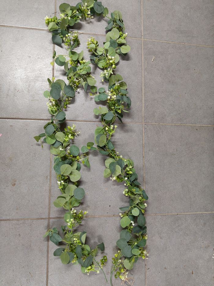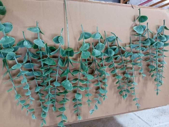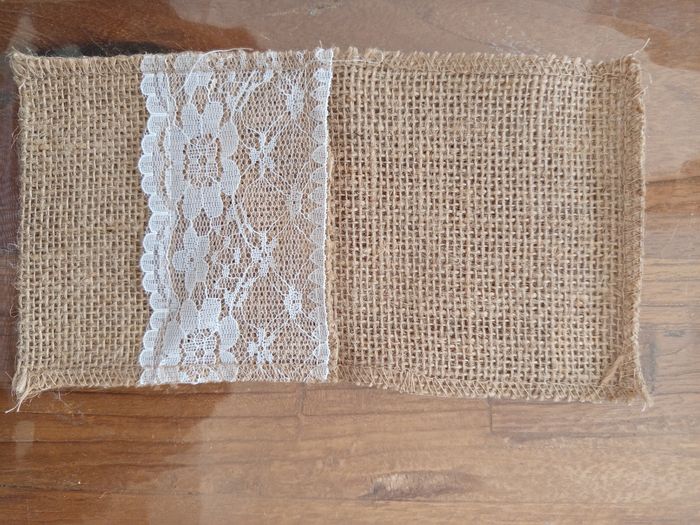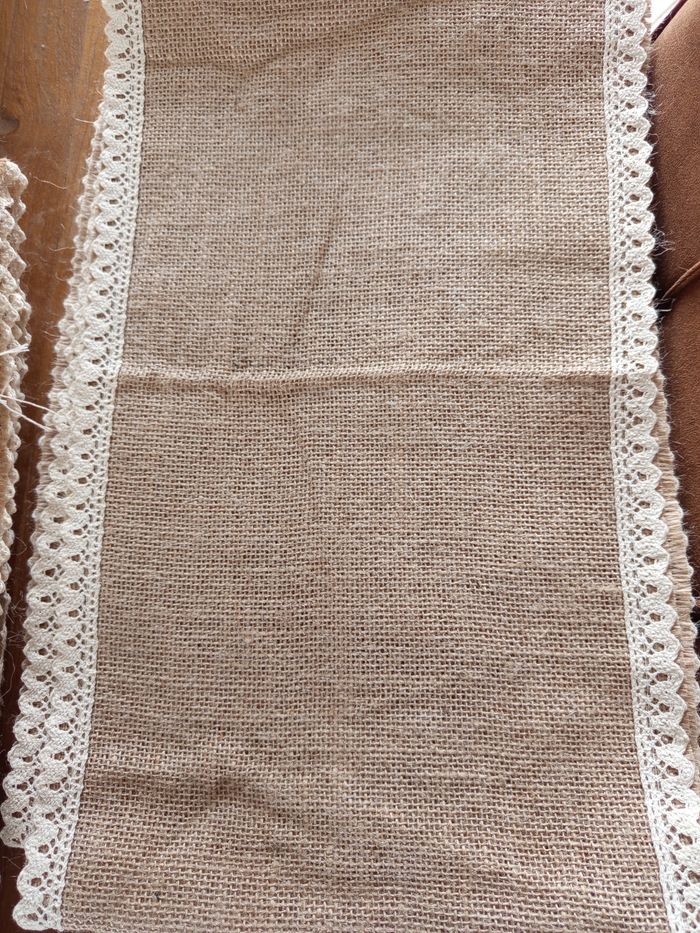 toile de jute avec dentelles pour chemins de table (largeur de 28 cm). 9 morceaux d'une longueur de 80 cm, 100 cm, 110 cm, 125 cm, 230 cm, 370 cm, 380 cm, 400 cm, 450 cm. - 60 porte couverts en toile de jute avec dentelle (11 cm*21 cm). - fleurs artificielles : tiges d'eucalyptus et 2 tresses.